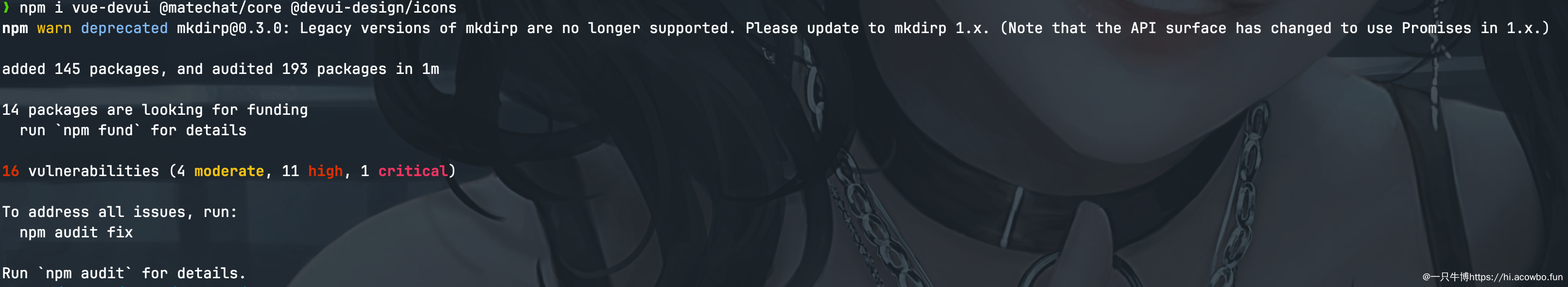 MateChat 依赖三个包:vue-devui(DevUI 的 Vue 3 版本)、@matechat/core(MateChat 核心库)、@devui-design/icons(图标库)。安装完成后共 145 个依赖包,虽然有一些历史版本的漏洞提示,但不影响教学使用。这里要注意三个包缺一不可,否则会出现组件无法渲染或图标不显示的问题。