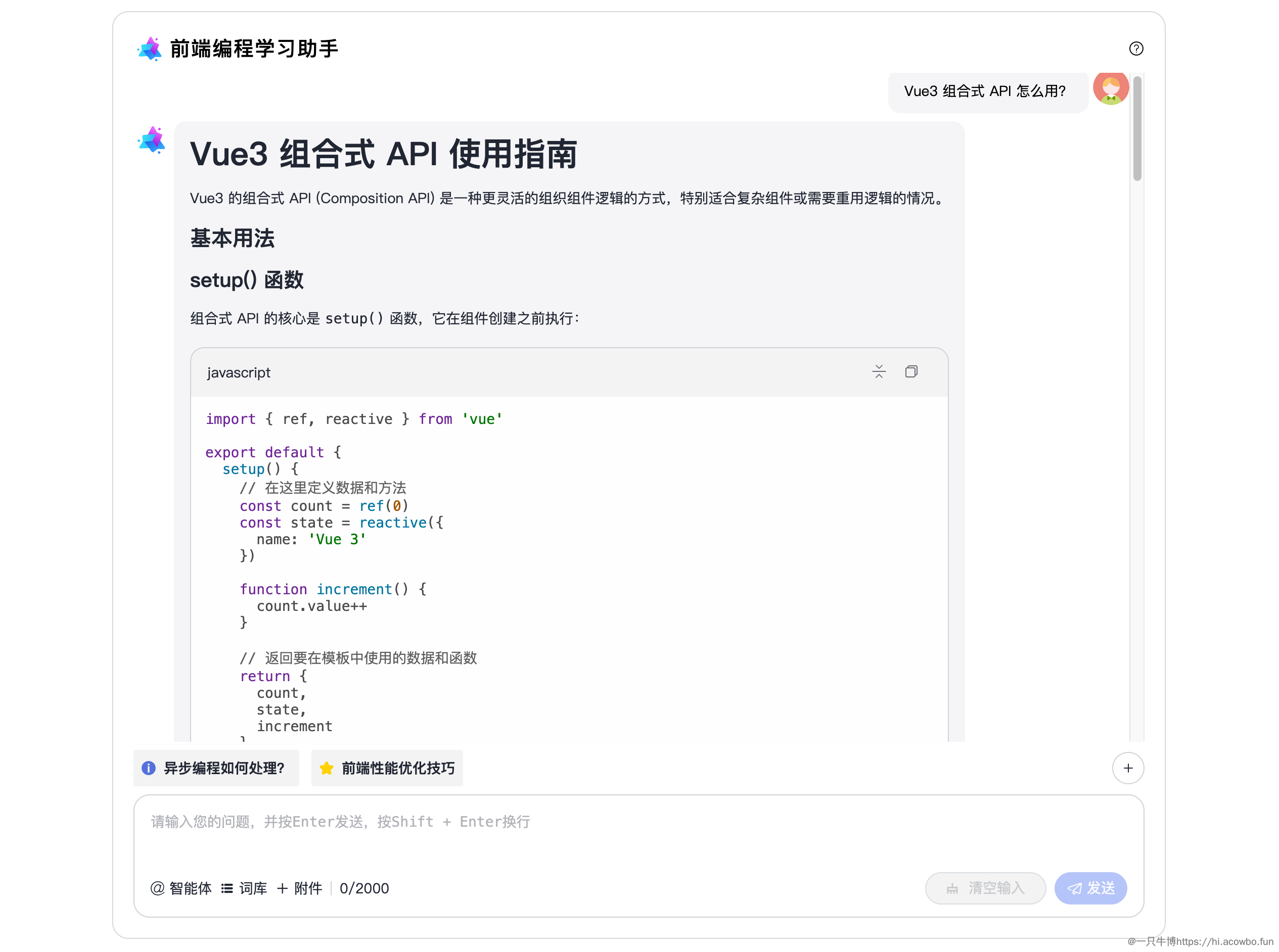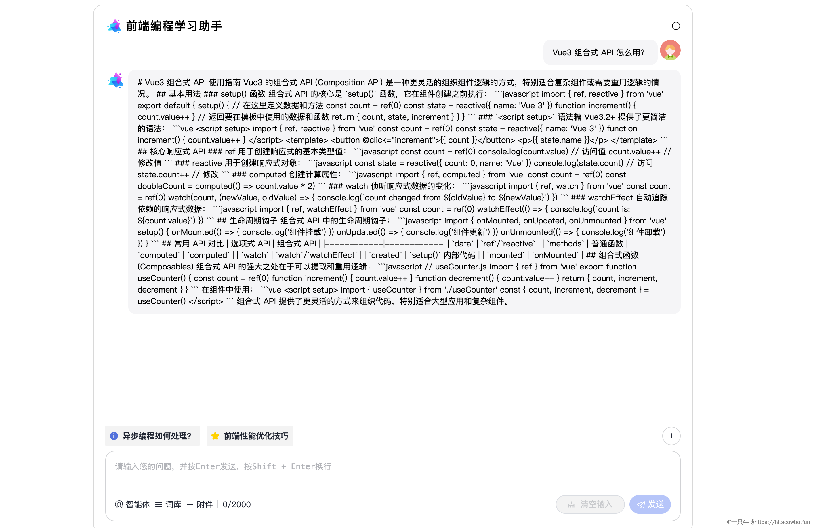 更重要的是,回答完之后,下方的快捷提示会推荐"异步编程如何处理"和"前端性能优化技巧",这就是知识点的关联推荐。学员自然而然地会想:学完 Vue 3 响应式之后,接下来该学什么?这个问题通过快捷提示给出了答案。