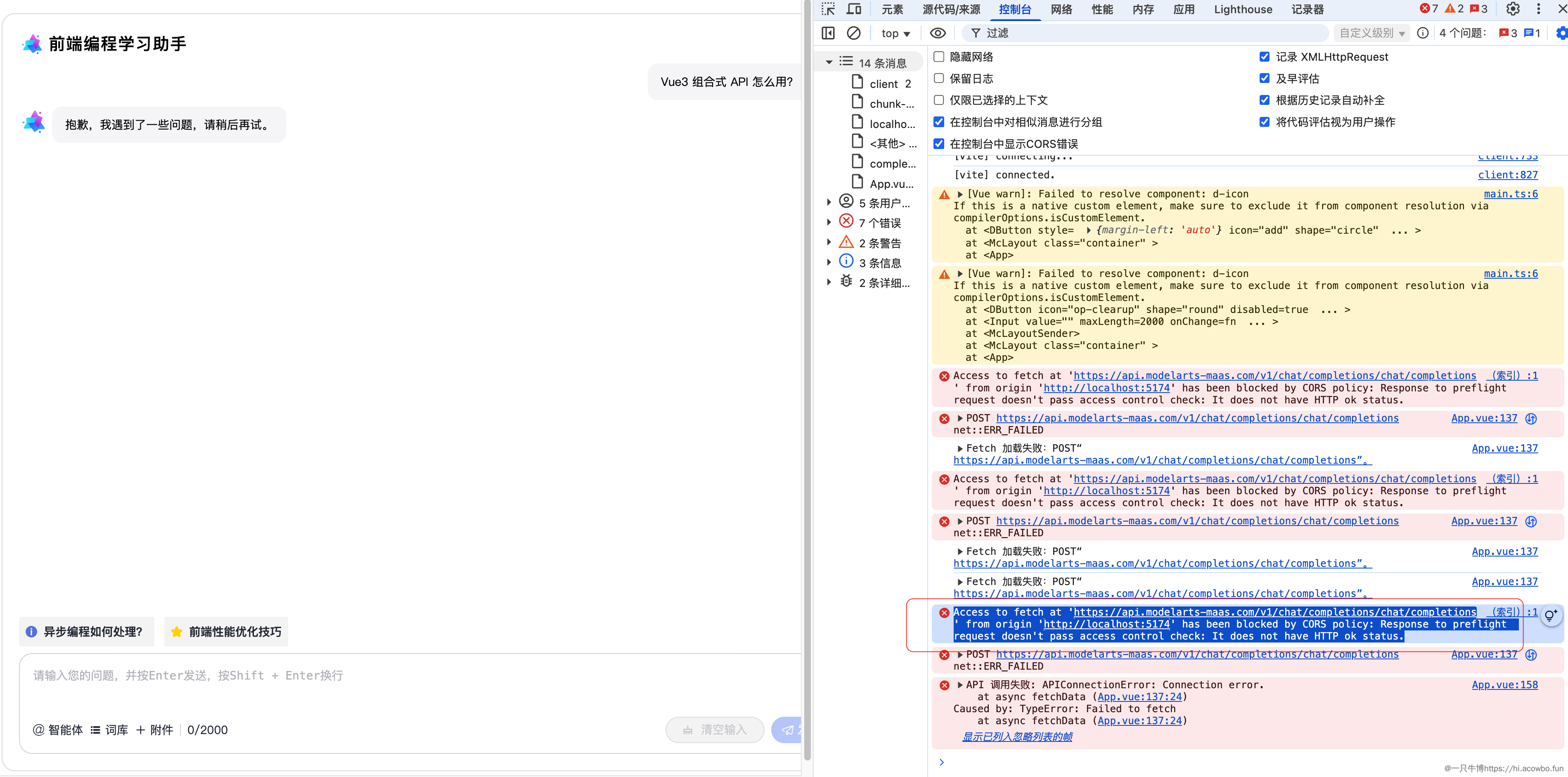 解决方案是在 vite.config.ts 中配置开发代理,将 /api 路径代理到 https://api.modelarts-maas.com。这样在开发环境下,浏览器认为请求是同源的,就不会触发 CORS 限制。需要注意的是,生产环境应该通过后端服务代理 API 调用,而不是在前端直接暴露 API Key。