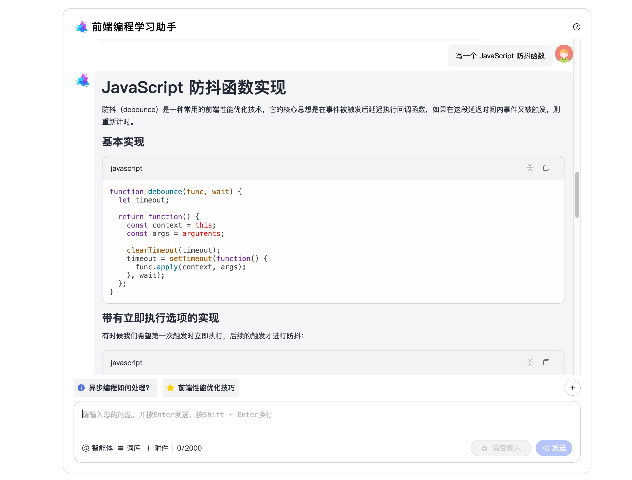要求生成防抖函数时,AI 不仅给出了基本实现,还提供了带有立即执行选项的高级版本,并解释了防抖的应用场景。这种教学方式比直接给答案更有价值:学员不但知道"怎么写",还理解"为什么这么写"和"什么时候用"。