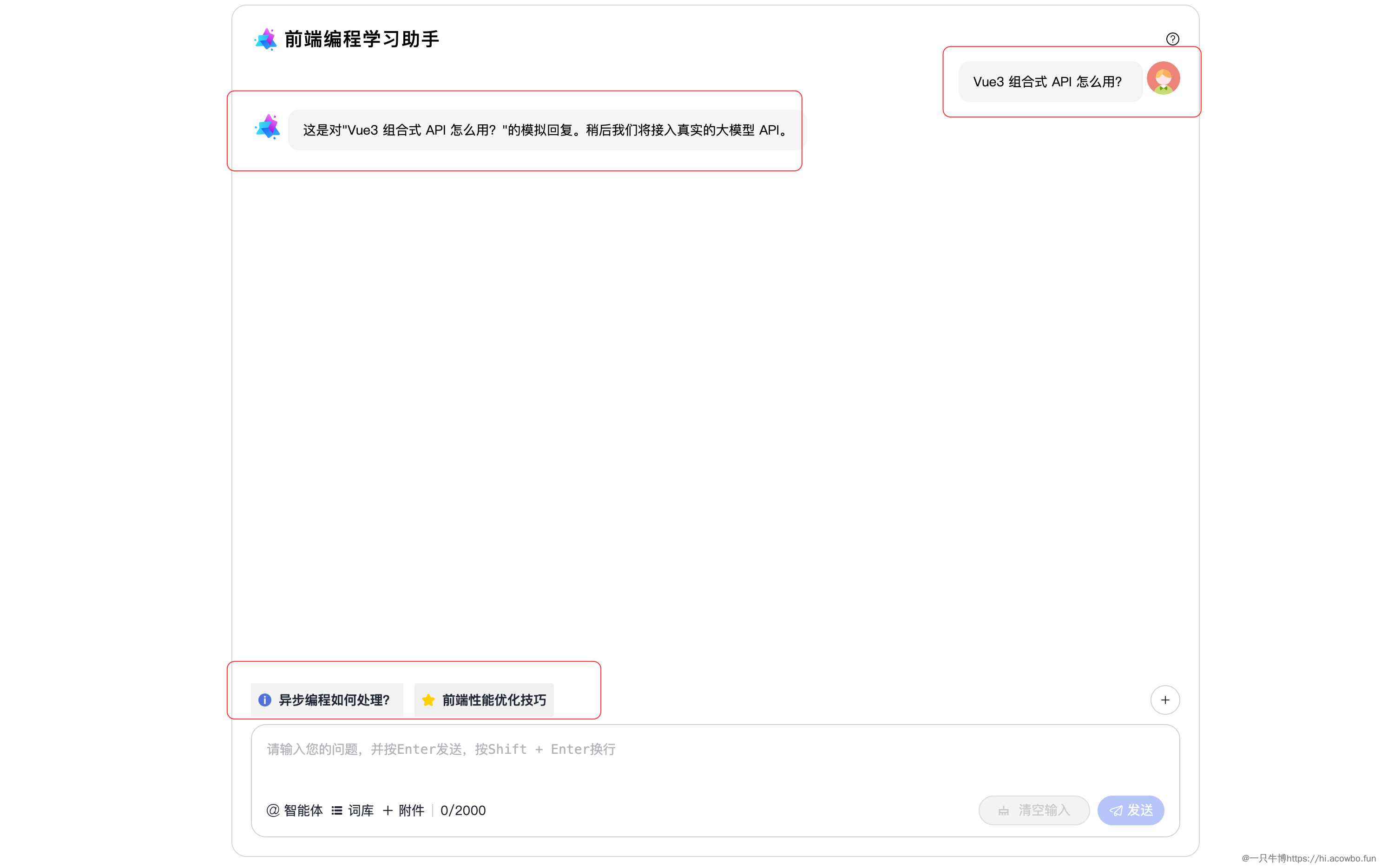 在接入真实 AI 之前,先用模拟数据测试界面。用户消息在右侧(白色头像),AI 回复在左侧(MateChat Logo),这种设计符合主流聊天应用的习惯,降低学员的学习成本。下方的快捷提示会根据当前话题动态变化,这是"学习路径个性化"的体现。
