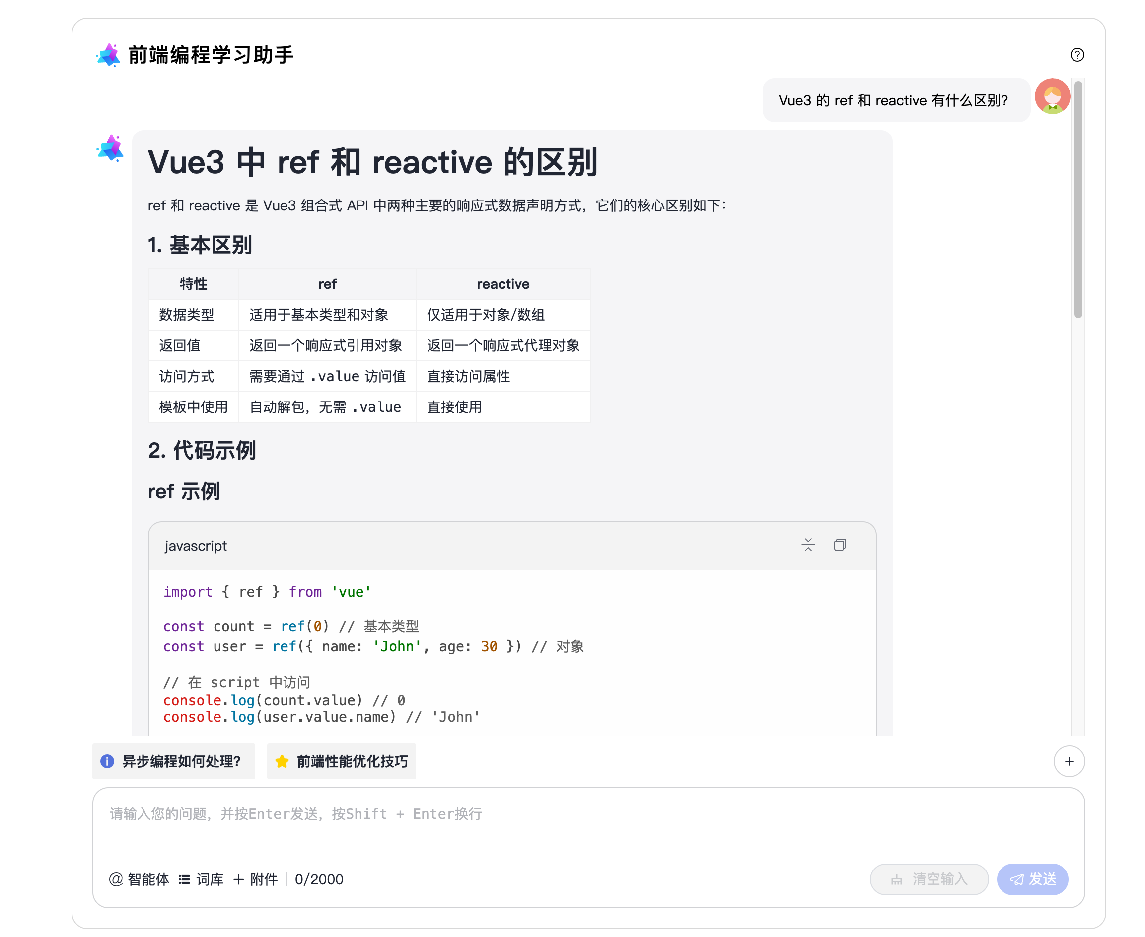提问"Vue3 的 ref 和 reactive 有什么区别"后,AI 用表格对比了两者的特性,然后给出代码示例。这种结构化的回答正是"知识体系化"的体现:不是简单告诉你有什么区别,而是从数据类型、返回值、访问方式等多个维度系统性地说明。学员看完这个回答,对 Vue 3 响应式 API 的理解就不再是碎片化的了。