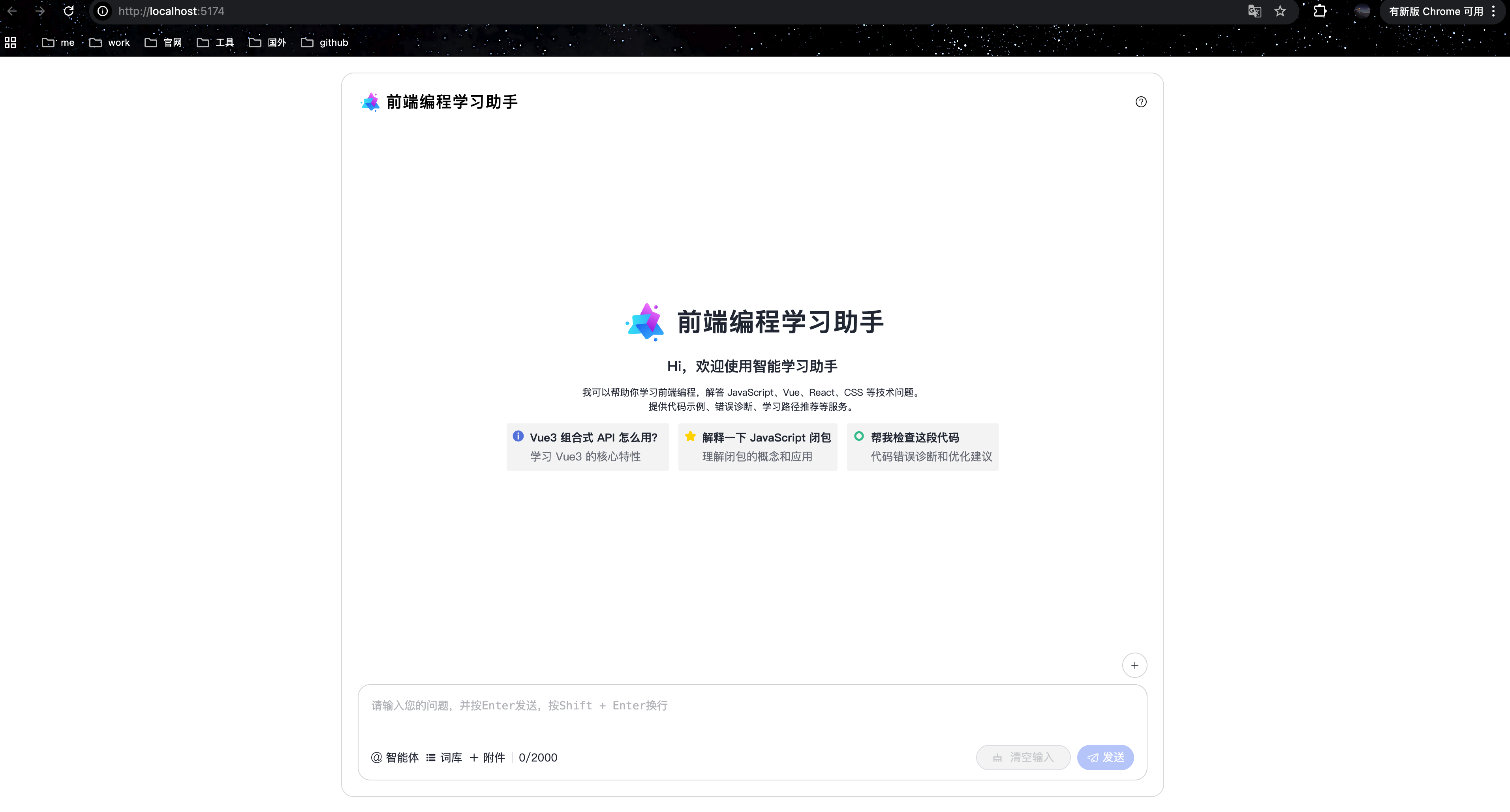 界面结构分为三部分:欢迎页、对话区、输入区。欢迎页用 McIntroduction 展示标题和描述,McPrompt 展示快捷提示。这里的快捷提示就是前面提到的"知识体系化"的体现:从基础概念("Vue3 组合式 API")到实践应用("JavaScript 闭包")再到代码诊断("帮我检查这段代码"),形成了一个完整的学习闭环。