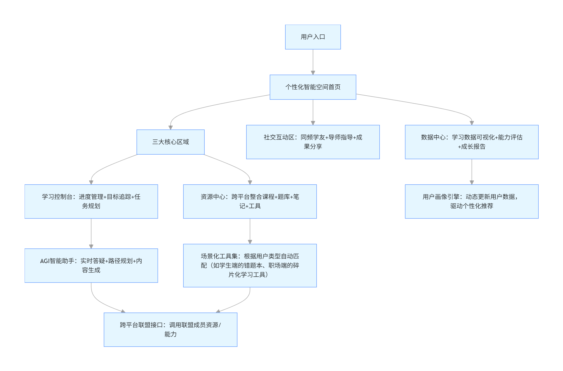 | 服务形态重构 | 标准化服务难以适配个体差异(如不同基础、不同目标、不同学习节奏的用户) | 个性化智能空间:为每个用户打造专属 "学习操作系统",整合学习资源、进度管理、智能工具、社交互动,实现全周期个性化陪伴 | 1. 多维度用户画像(知识、能力、习惯、目标)动态更新;2. 自适应学习路径实时调整;3. 场景化工具自动匹配(如职场用户自动加载碎片化学习工具,学生用户自动匹配同步辅导资源) |