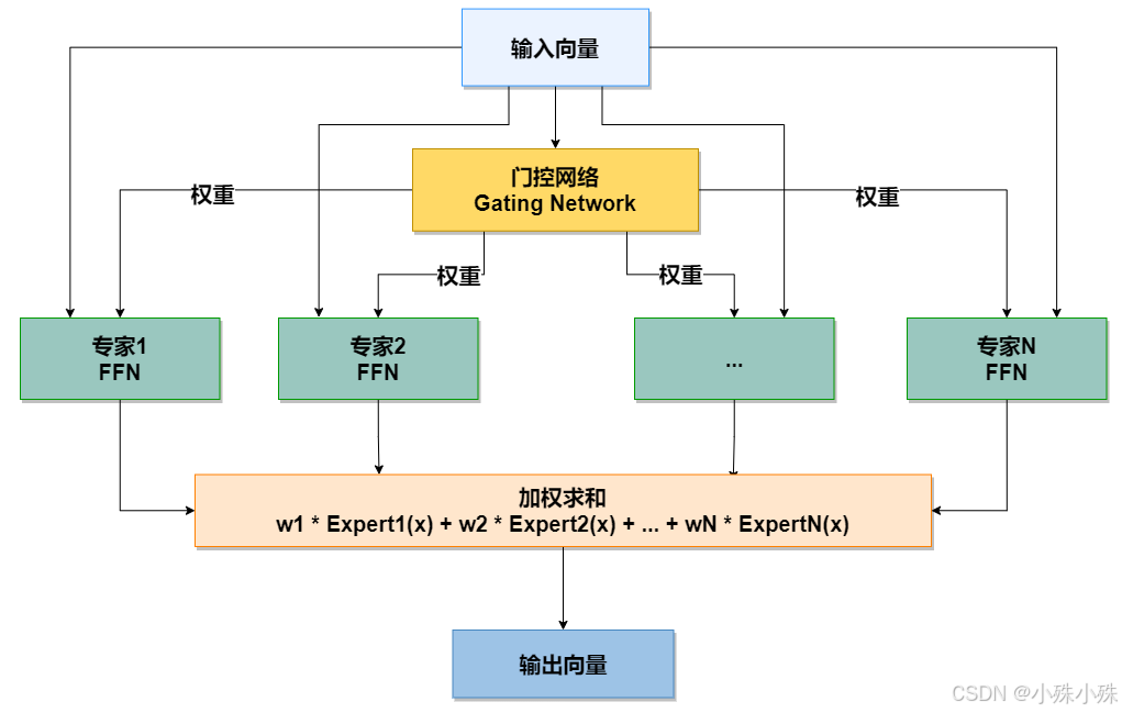 公式: Output = w1 * Expert1(x) + w2 * Expert2(x) + ... + wN * ExpertN(x)