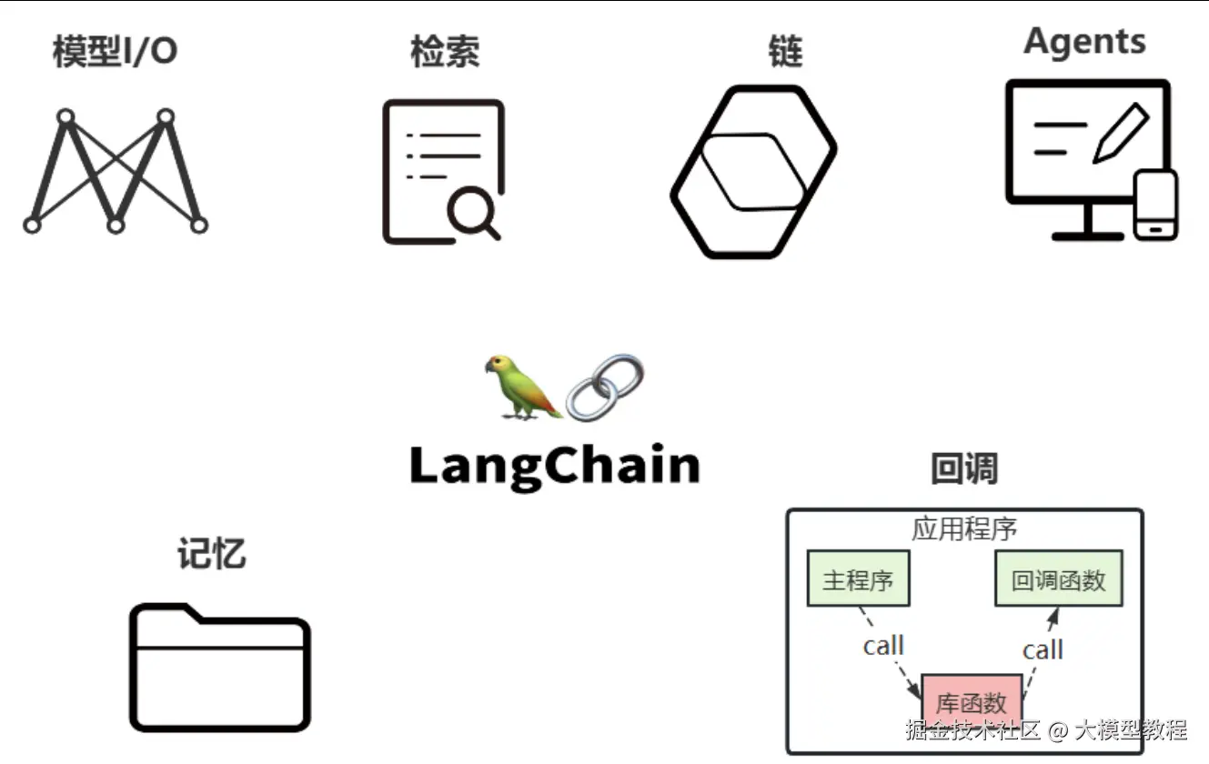 langchain的核心组件涉及到六大模块,这六大模块提供了一个全面且强大的框架,使开发者能够创建复杂,高效且用户友好的基于大模型的应用