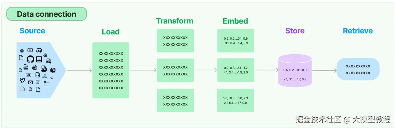 - source:数据源,即大模型可以识别的多种类型的数据:视频、图片、文本、代码、文档等