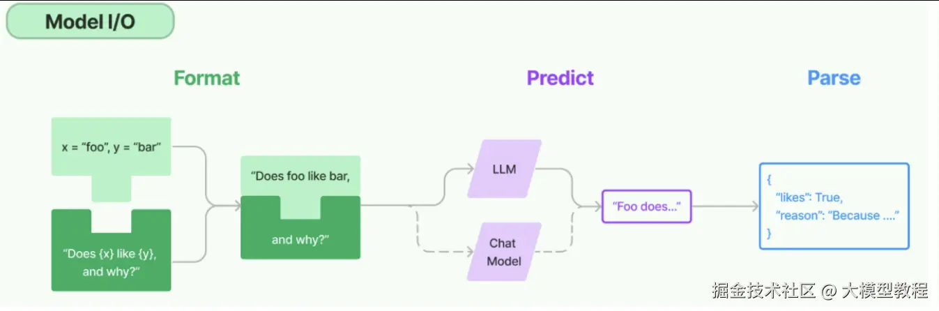 - Predict(预测) :指代Models,使用通用接口调用不同得到大语言模型。接收被送进来的问题,然后基于这个问题进行预测或生成回答