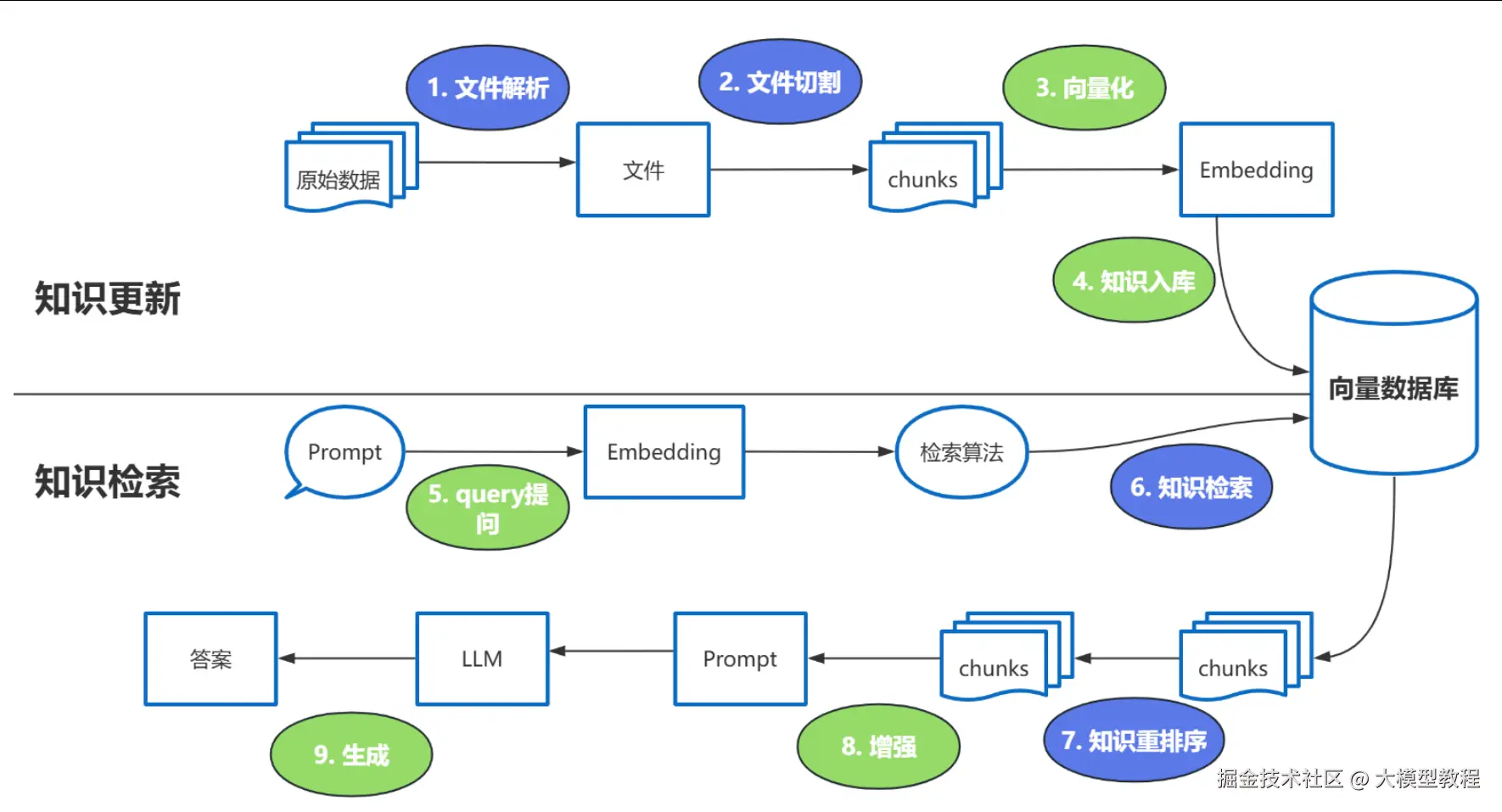 整体在开发过程中蓝色部分是难点:1、文件解析 2、文件切割 3、知识检索 4、知识重排序(Reranker)