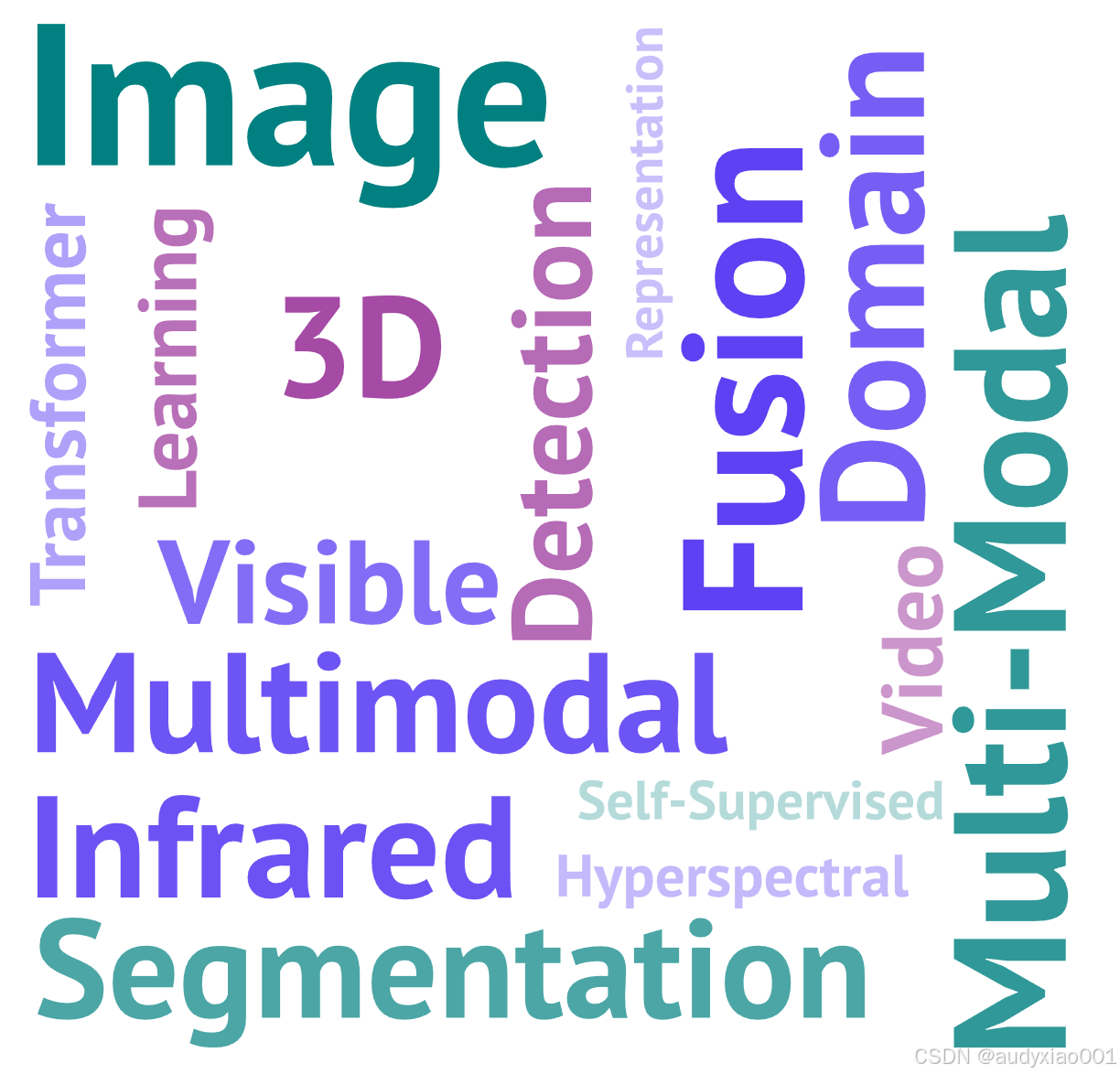 "Detection(检测)"和"Learning(学习)"各出现6次,体现了目标检测任务的持续热度与学习方法的基础性地位。检测任务涵盖伪装目标、场景文本、通用目标等多个细分方向,学习方法则在提示学习、协同学习、自监督学习等领域不断创新,为各类任务提供技术支撑。"Visible(可见光)"和"Infrared(红外)"各出现5次,反映出红外,可见光跨模态任务,如图像融合、对齐已成为特定场景,如军事侦察、夜间监测下的重要研究分支,两类数据的互补性使其在复杂环境感知中具有不可替代的价值。