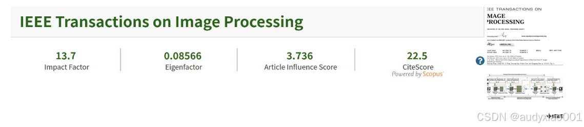 IEEE Transactions on Image Processing是计算机视觉和图像处理领域的顶级期刊。期刊主题涵盖图像、视频及多维信号在广泛应用场景中的生成、采集、处理、通信、分析与显示的新理论、算法及体系结构,重点议题包括(但不限于)图像、视频及多维信号的数学/统计/感知建模、表示、生成、编码、滤波、增强、复原、渲染、半调处理、检索与分析。期刊主要应用领域涉及图像视频通信、电子成像、生物医学成像、图像视频系统及遥感技术。