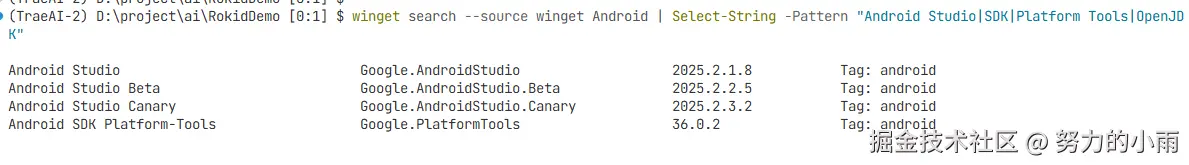 winget search --source winget Android | Select-String -Pattern "Android Studio|SDK|Platform Tools|OpenJDK"