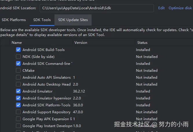 启动Android SDK Studio后,我们进入设置页找到"SDK Tools",找到相关的工具,点击下载即可,如图所示: