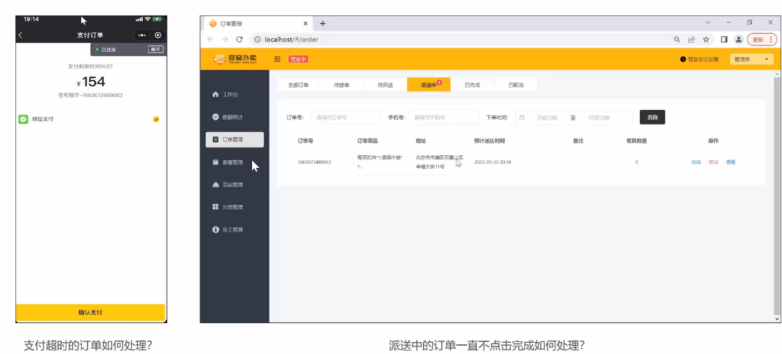 还有派送订单,在派送成功以及用户收到后我们就会点击完成,而如果没点的话我们也需要通过程序来处理。