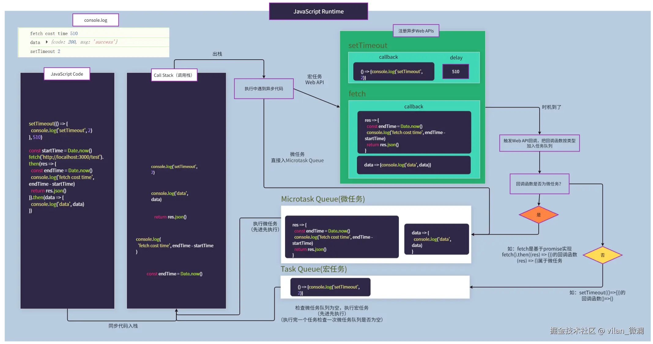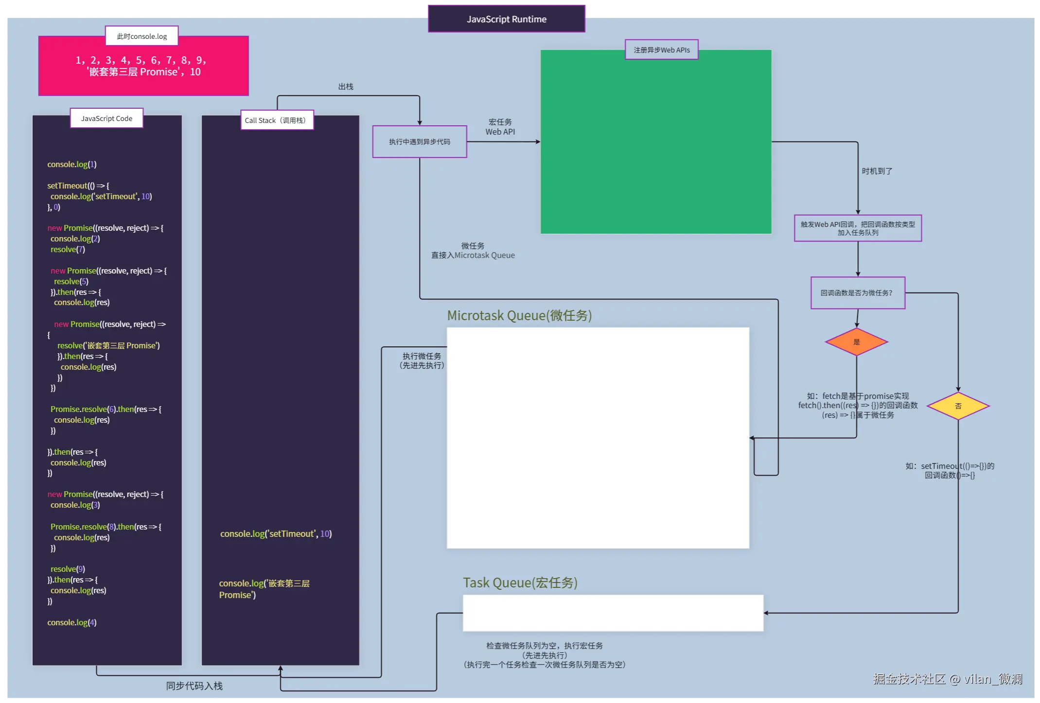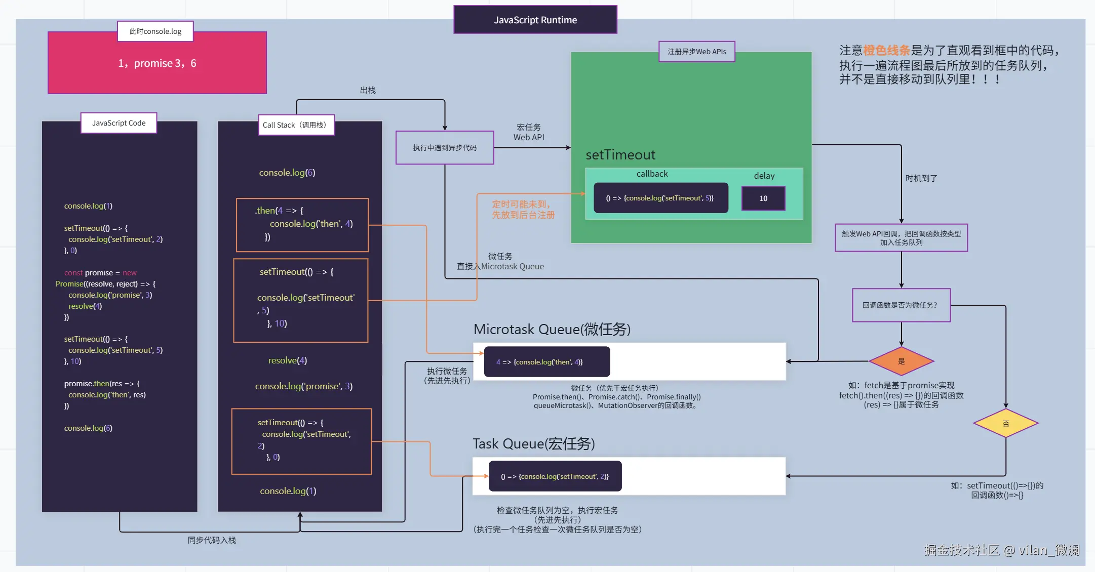 这可能只是简单的JavaScript代码执行事件循环流程,目的也是让大家更直观理解其中原理。实际执行过程可能还会读取堆内存 获取引用类型数据、操作dom的方法,可能还会触发页面的重排、重绘 等过程、异步文件读取和写入操作、fetch发起网络请求,与服务器建立连接获取网络数据等情况。