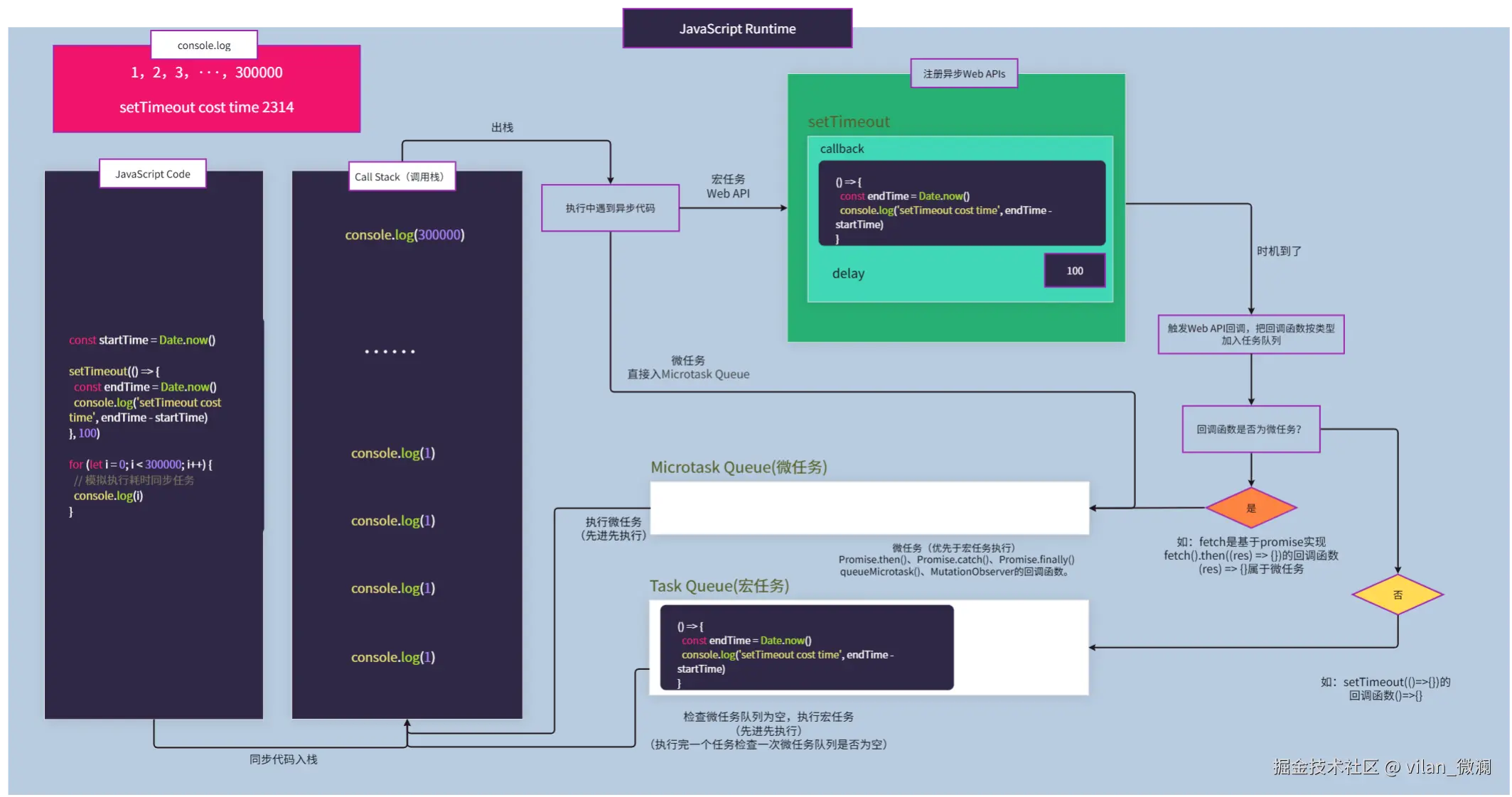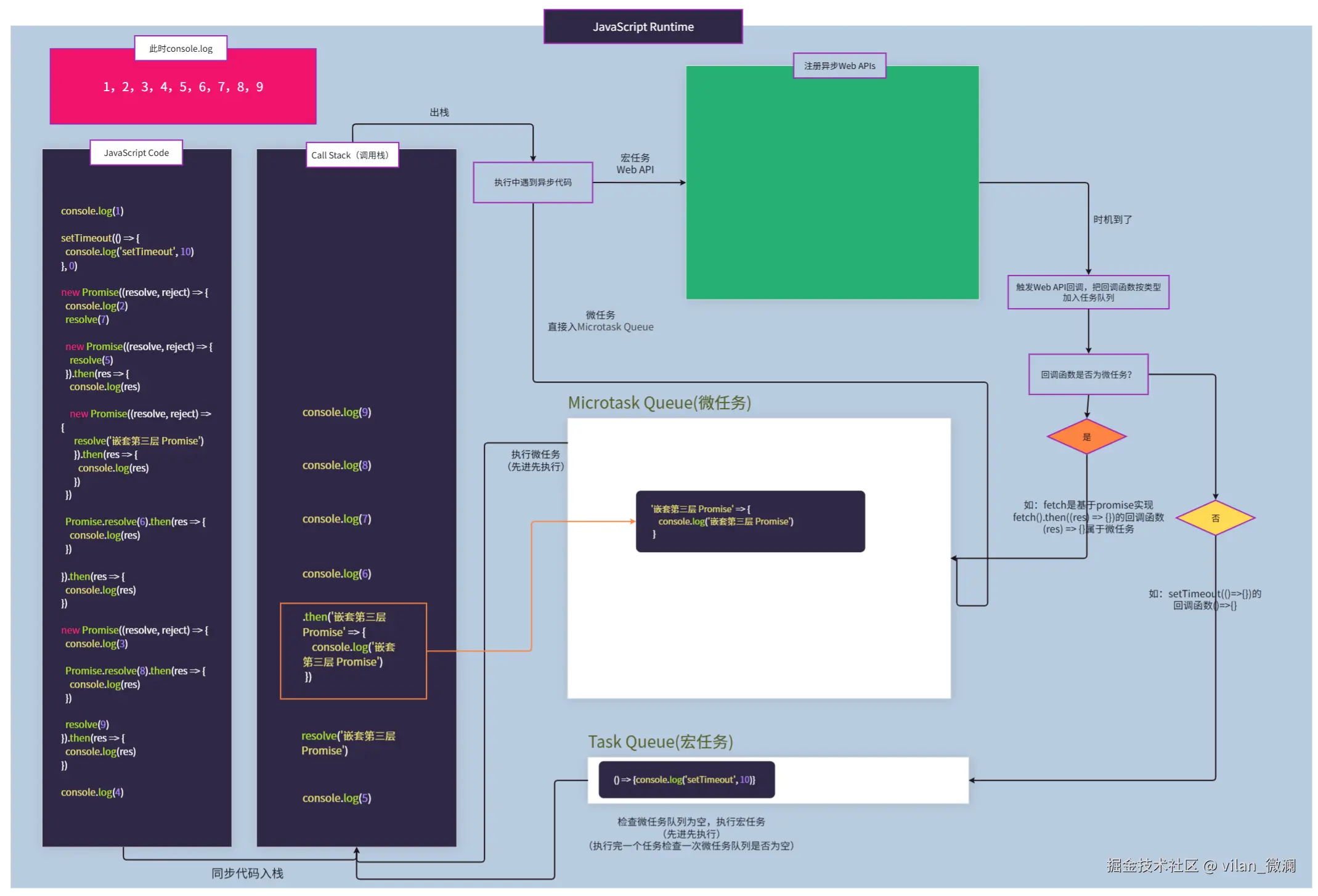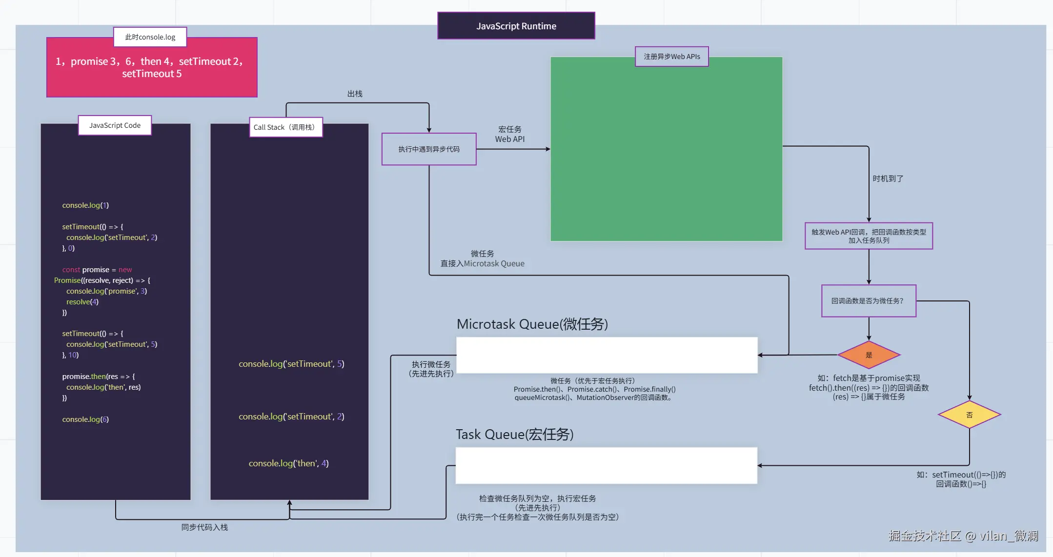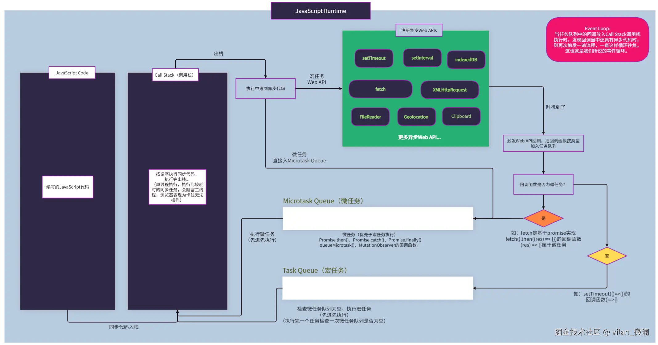 事件循环 是JavaScript为了处理单线程 执行代码时,能异步 地处理用户交互、网络请求等任务 (异步Web API) ,而设计的一套任务调度机制 。它就像一个永不停止的循环,不断地检查(结合上图就是不断检查Task Queue和Microtask Queue这两个队列)并需要运行的代码。