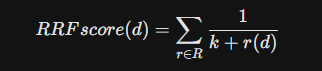 融合算法(Fusion):最常用的融合方法是倒数排名融合(Reciprocal Rank Fusion, RRF)。