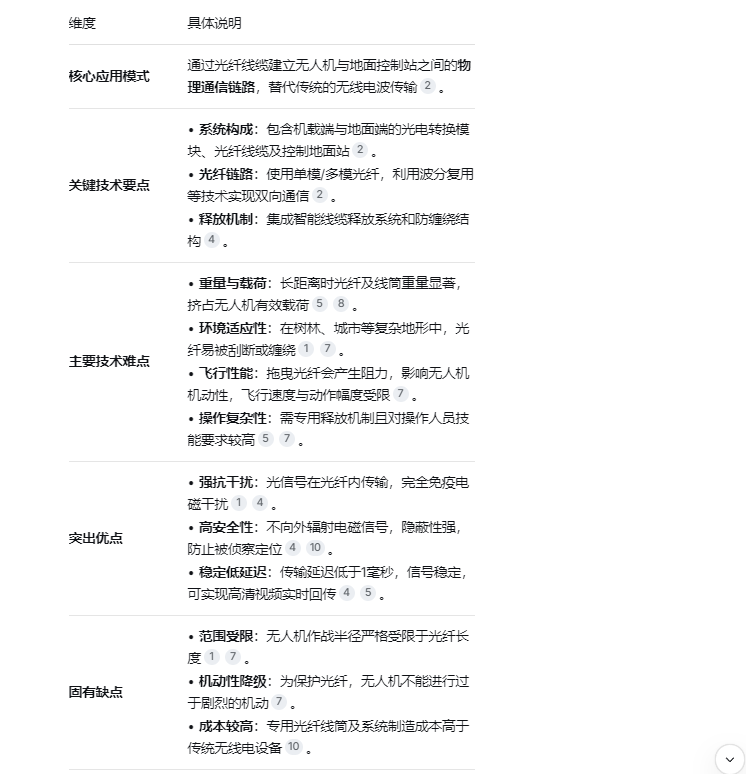 下面这个表格整理了光纤无人机通信模式的技术要点、难点和优缺点。