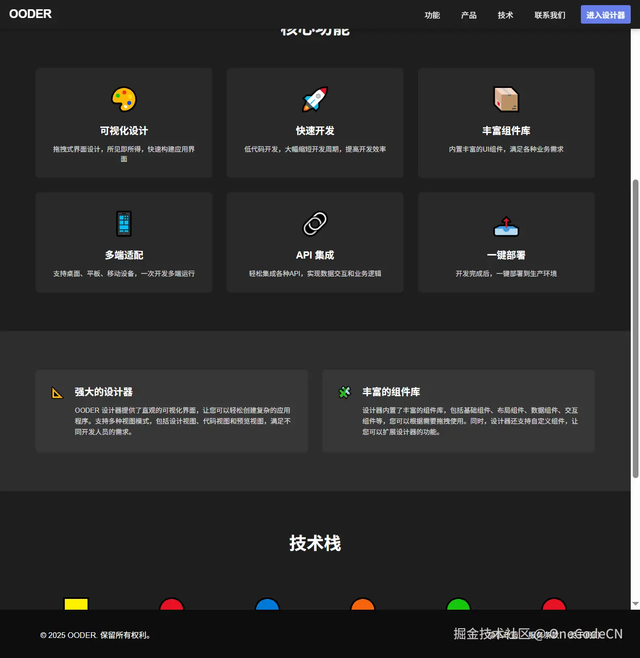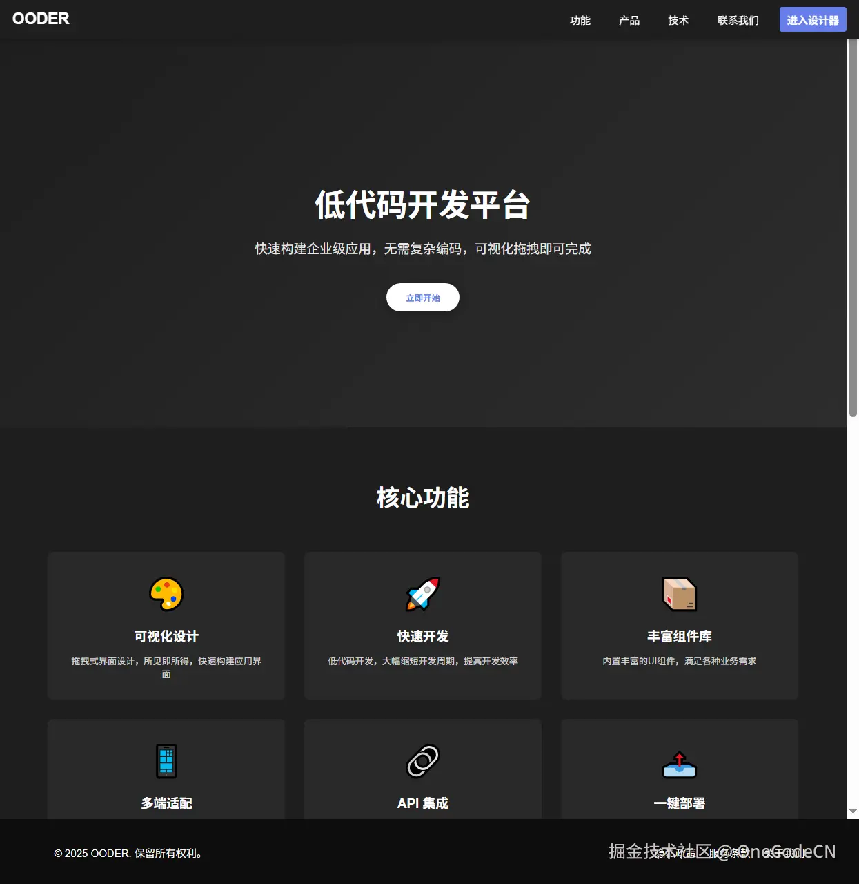 在现代Web开发中,"设计稿快速落地"与"全栈架构可维护性"是两大核心诉求。本文的实战起源于一次典型的AI开发协作场景------作者采用"trae solo模式"与AI工具Solo协同,目标是为OODER全栈框架打造官方宣传网页。初始需求明确:基于一份大气时尚的设计稿,通过Solo的"图生代码"能力快速生成页面。Solo高效完成了第一版交付,但其输出的传统HTML+CSS代码暴露出两大关键问题:一是纯前端代码与OODER全栈架构脱节,无法复用框架的后端接口、状态管理等核心能力;二是代码耦合度高,既不支持组件化复用,更无法通过OODER专属的RAD设计器进行可视化编辑与管理。