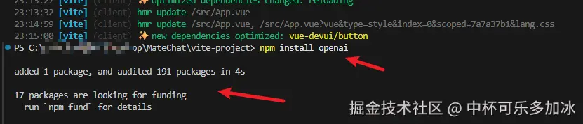 然后输入:npm i vue-devui @matechat/core @devui-design/icons ,安装所需的依赖文件,这里要注意使用node 20.19+或者 22.12+的版本,否则无法使用vite。