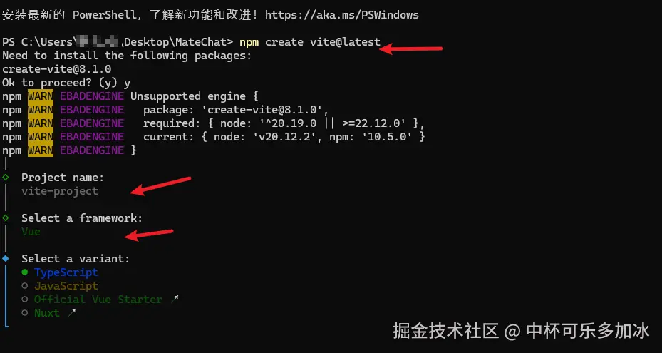 首先进入控制台,输入npm create vite@latest使用vite首先初始化一个vue+ts项目,选择Vue和JS: