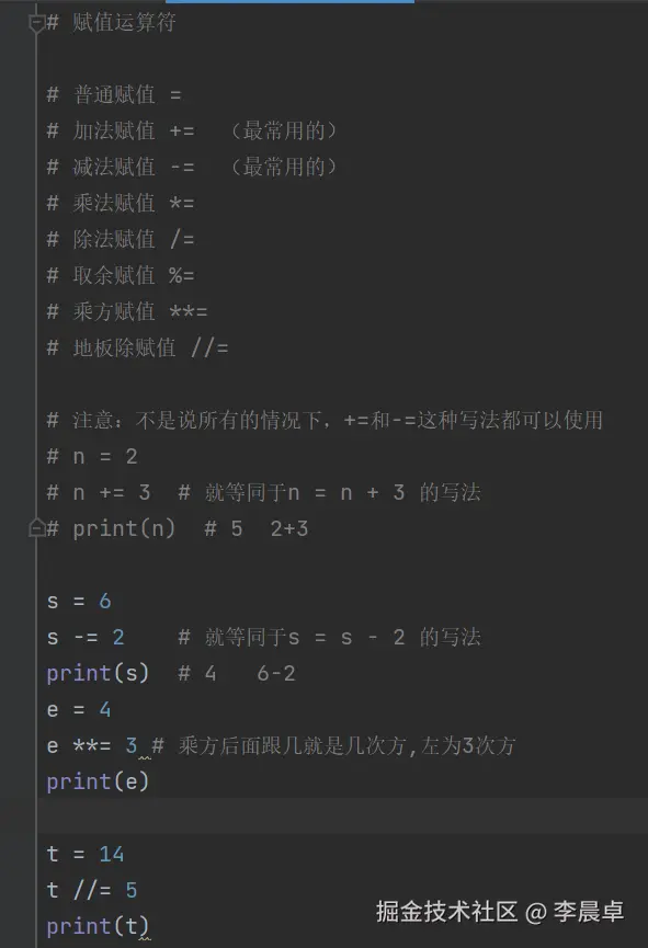 赋值运算符与前端基础学习的基本一致,注意\\=是除法向下取整,而**=n这个n就是多少次幂。