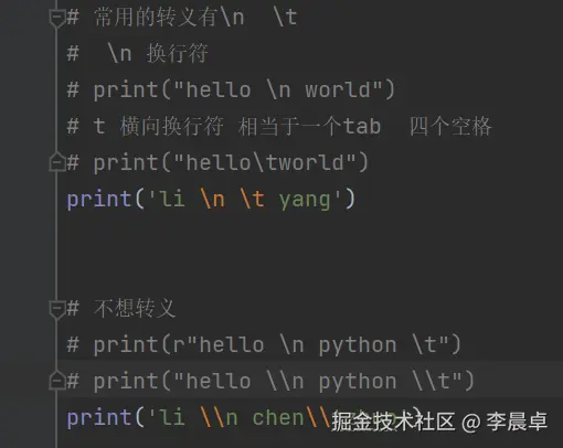 常用的有\n,表示换行,\t,表示在字符串之间加一个'TAB'键,相当于4个空格。而当我们不想转义时,不让\n、\t发挥作用,就要\n与\t,只表示普通的字符串\n与\t,没有其他特殊含义。