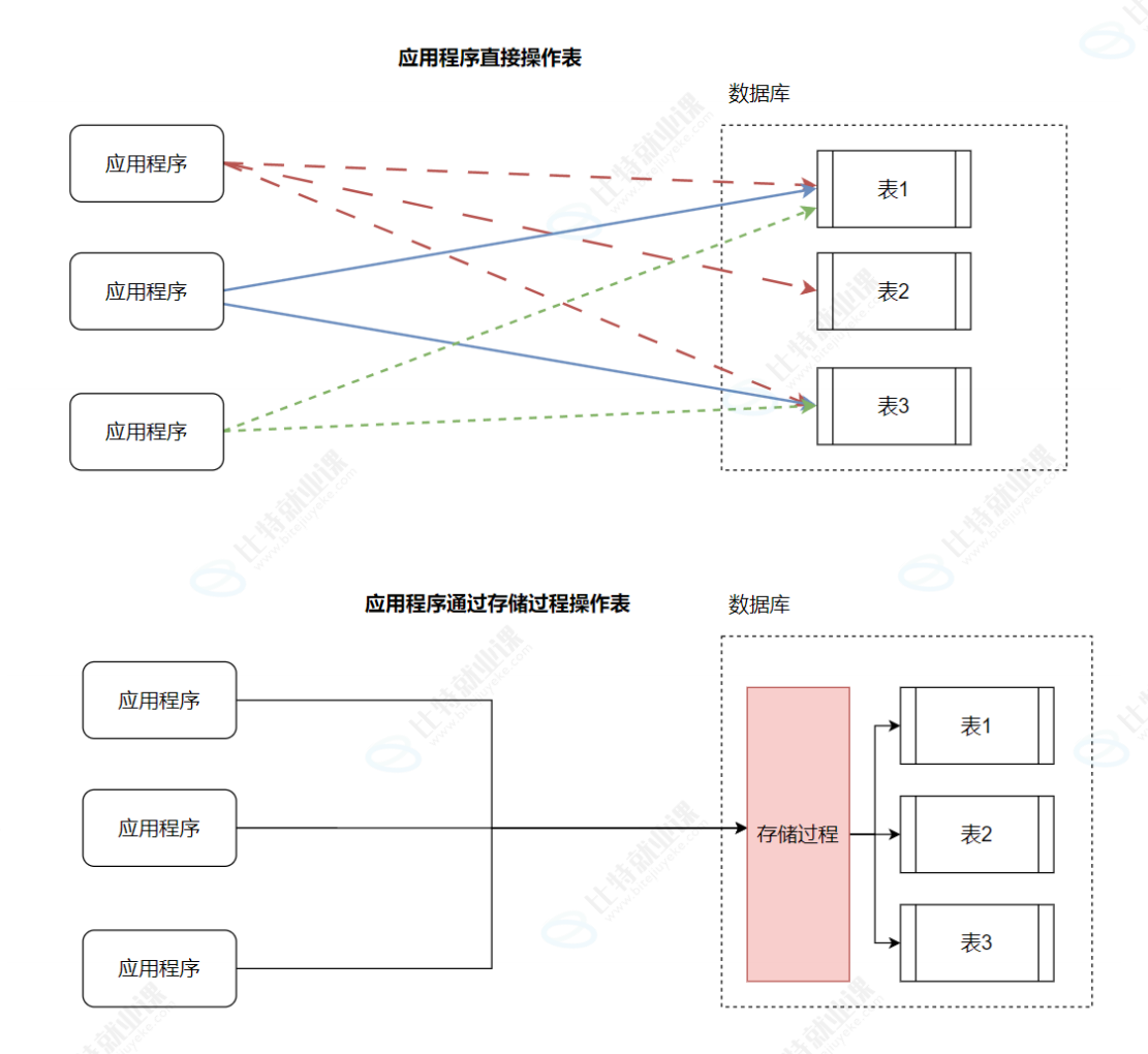 安全性:可以限制⽤⼾直接访问数据库,通过存储过程间接访问,从⽽保证系统安全性。**降低耦合:**当表结构发⽣变化时,只需要修改相应的存储过程,应⽤程序的改动较⼩。