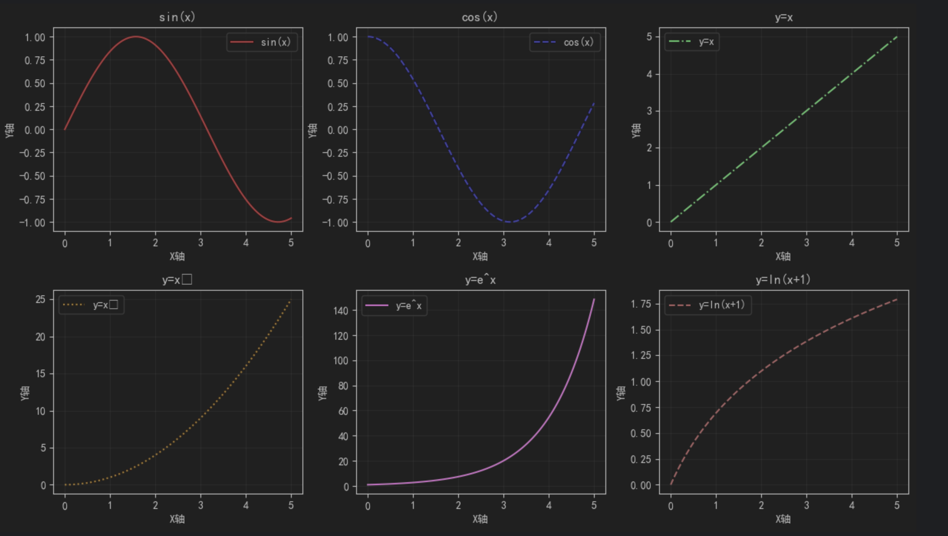 运行后会生成6个风格统一的子图,每个子图对应不同的函数曲线,代码简洁且易于扩展。