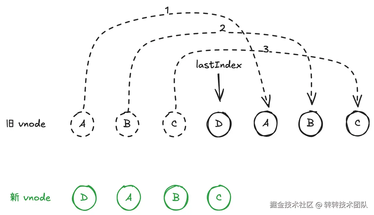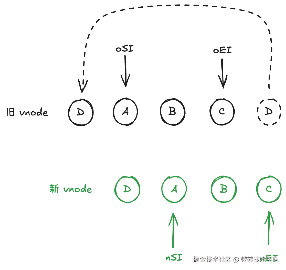 prefix/suffix),把问题缩减到中间区。 - 为新中间区建立 key 映射,生成旧中间区到新索引的映射数组,同时对可复用节点执行