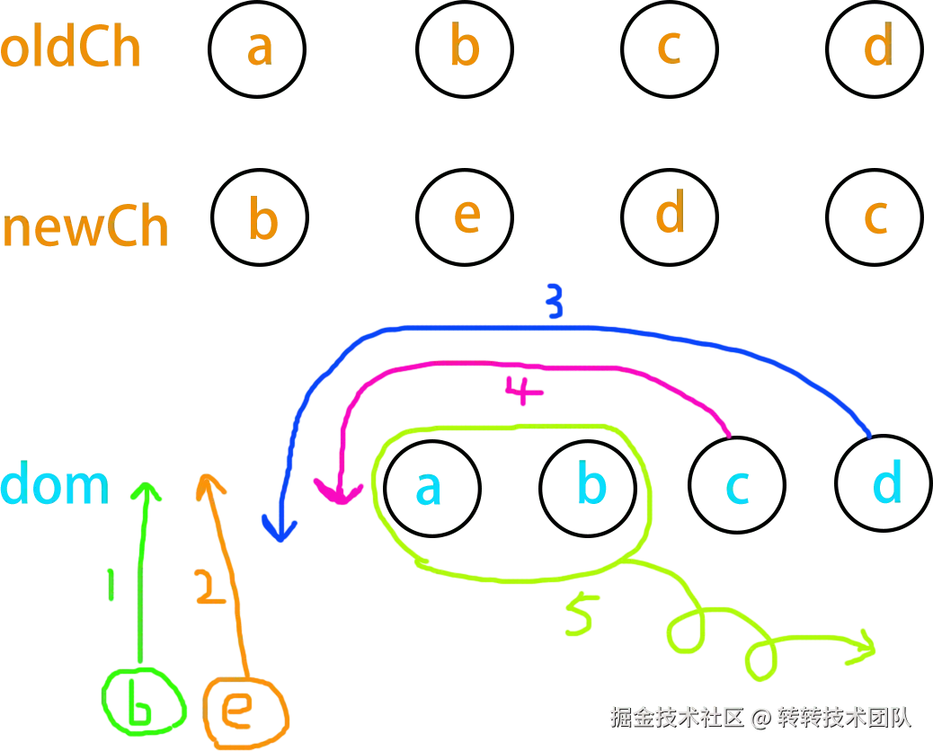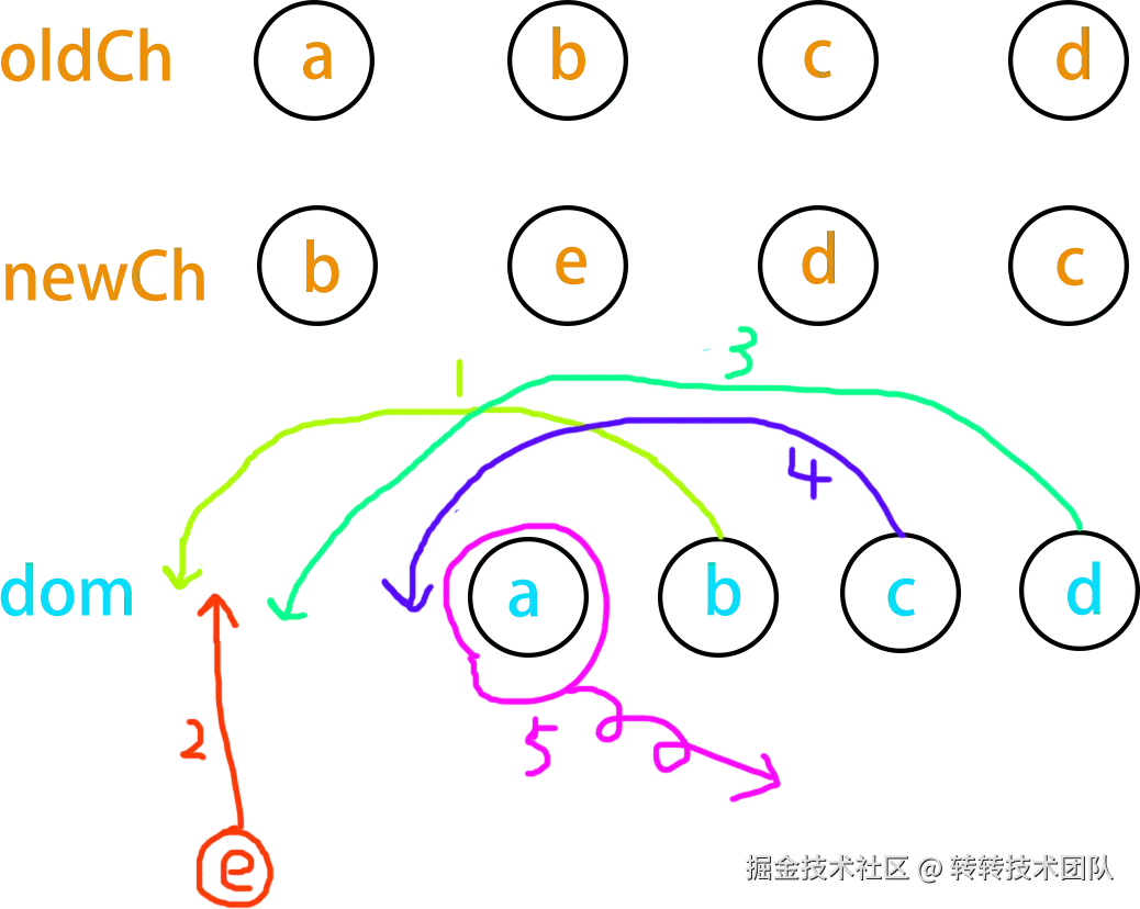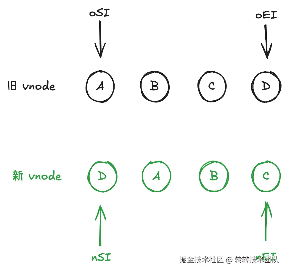 举例:若发现 oldEndVnode 与 newStartVnode 是同一节点(sameVnode),则说明原列表的尾部节点在新列表中移到了开头。执行 patchVnode 时,会将对应的真实 DOM 节点移动到新列表的开始位置。
