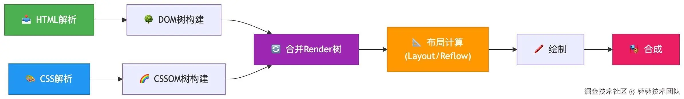 浏览器首先通过解析代码分别构建 DOM 和 CSSOM,然后将两者结合生成渲染树。渲染树用于计算页面上所有内容的大小和位置。布局完成后,浏览器才会将像素绘制到屏幕上。其中,布局计算/重排(Layout/Reflow)是渲染过程中最核心的性能瓶颈。