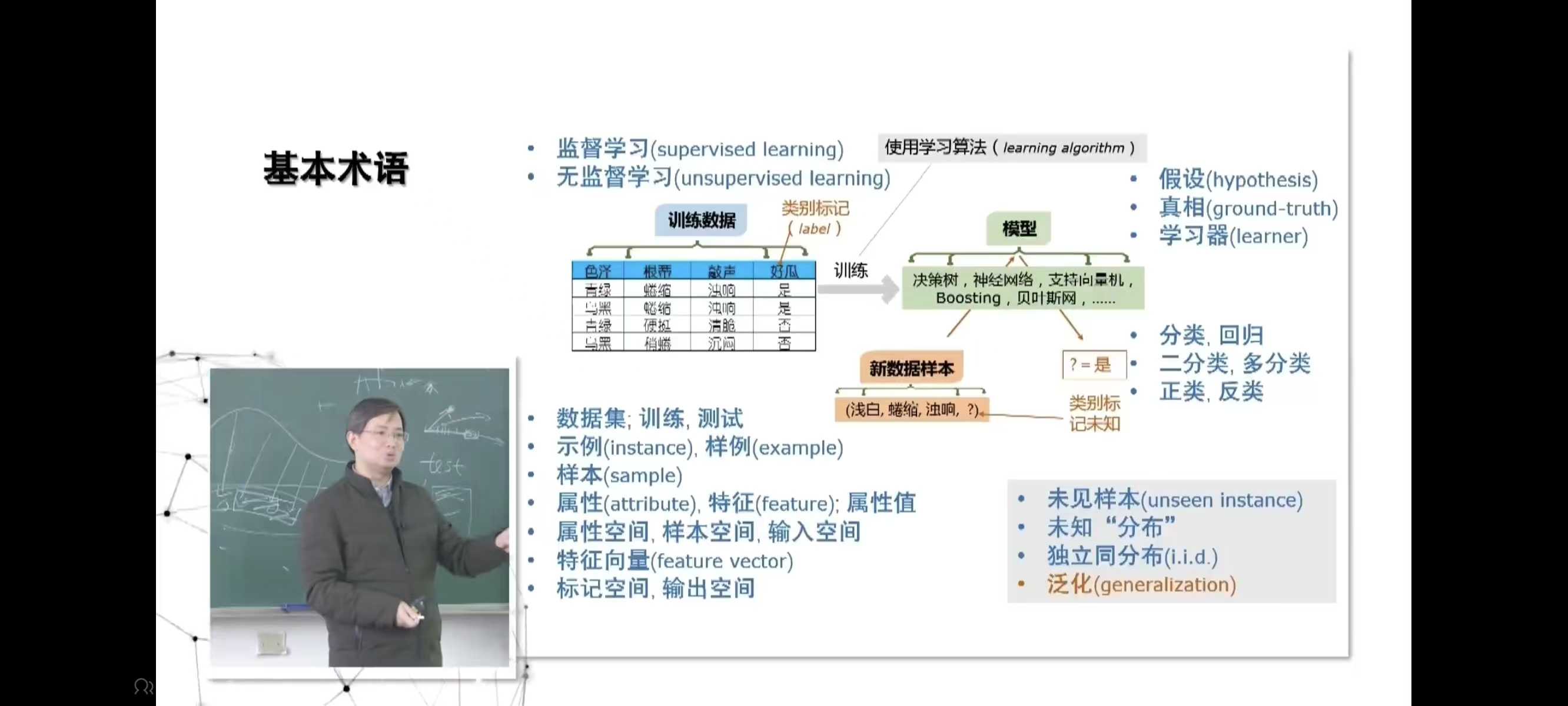- 训练数据:用于训练模型的数据集,包含示例的属性和对应的类别标记(如示例中判断西瓜是否为好瓜的数据集。数据集包含为西瓜的图片以及已经标记好坏的结果)