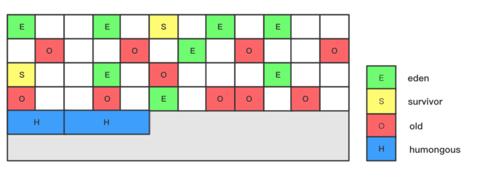 从上图可以看到,每个 Region 被标记了 E、S、O 和 H,说明每个 Region 在运行时都充当了一种角色。所有标记为 E 的都是 Eden 区的内存,它们散落在内存的各个角落,并不要求内存连续。同理,Survivor 区、老年代(Old)也是如此。