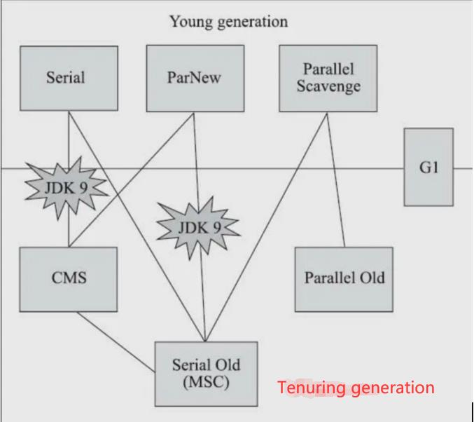 如果两个收集器之间存在连线,就说明它们可以搭配使用 ,图中收集器所处的区域,则表示它是属于 新生代收集器抑或是老年代收集器。