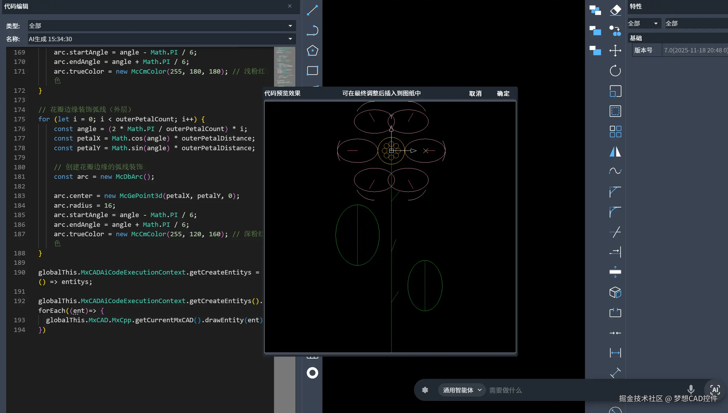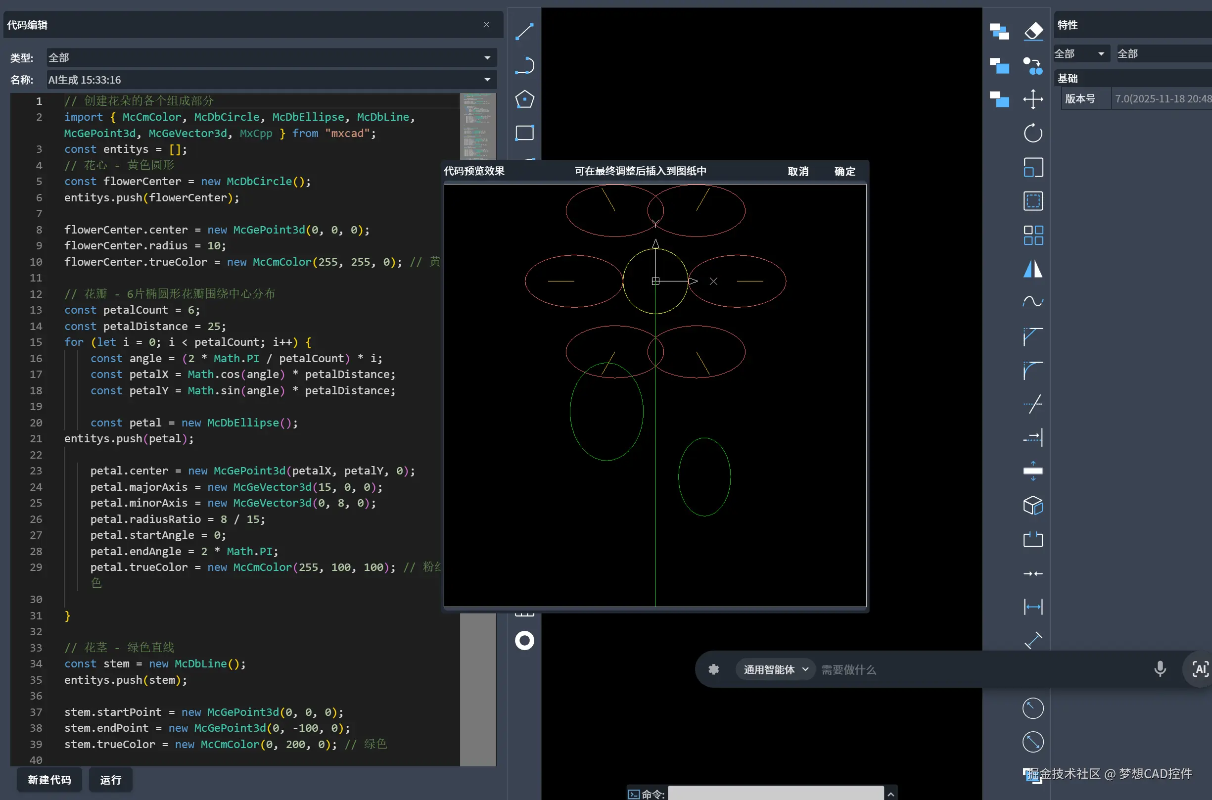 等待一会儿, 就把代码生成出来给你看,并且还有预览效果,如果满意的话点击确认就可以把这朵花插入到图元中了。如果不满意,我们可以继续与AI对话进行修改,如下图: