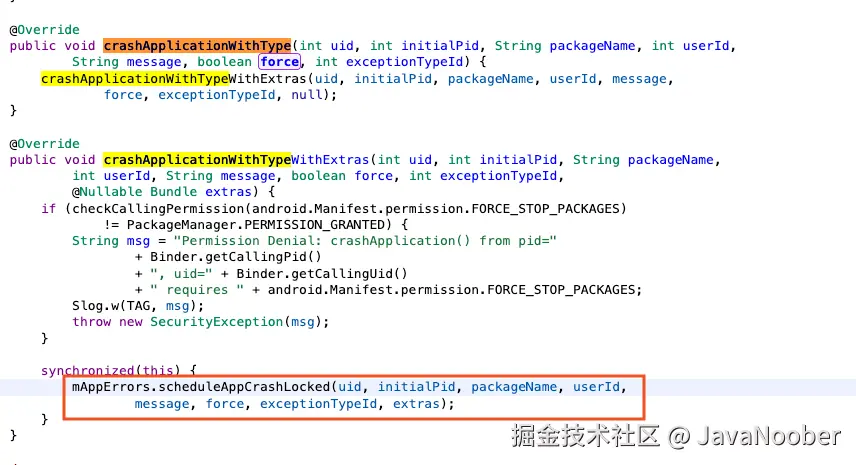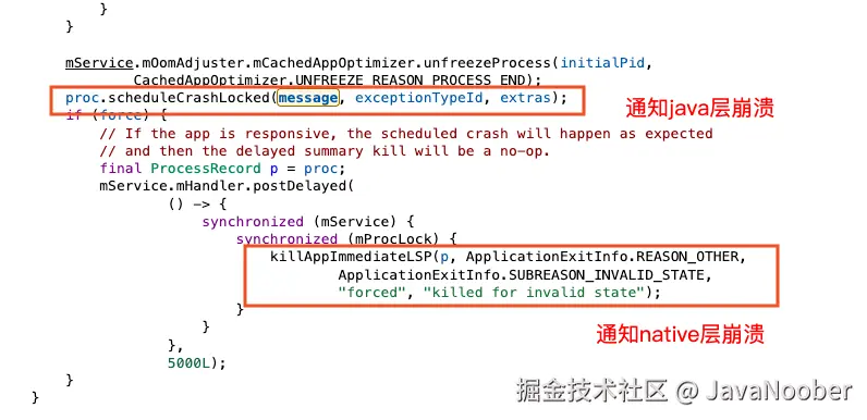 crashApplicationWithType最终调用AppErrors.scheduleAppCrashLocked,该方法并行执行了两项操作:- 操作 1:发送 Crash 指令 (对应阶段二日志) 调用