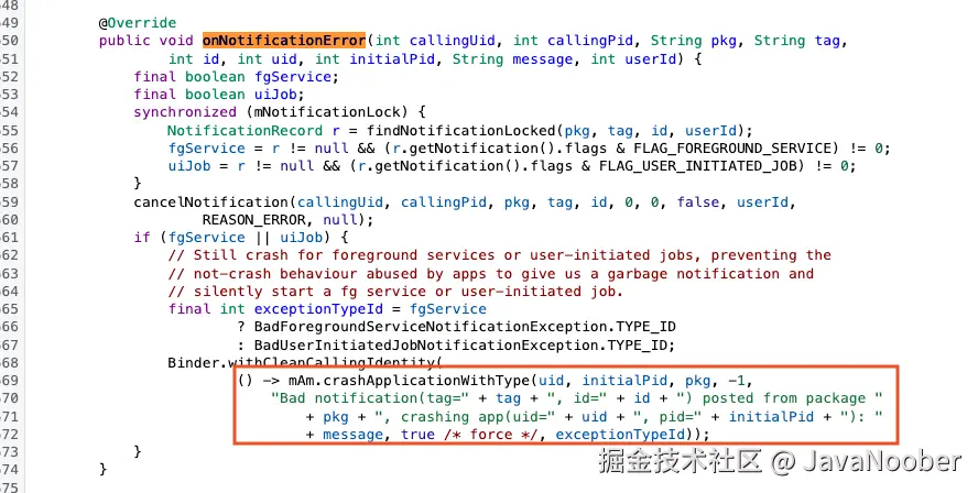 onNotificationError中构建错误描述:"Bad notification(tag= ....."。 onNotificationError调用ActivityManagerService(AMS) 的crashApplicationWithType方法。