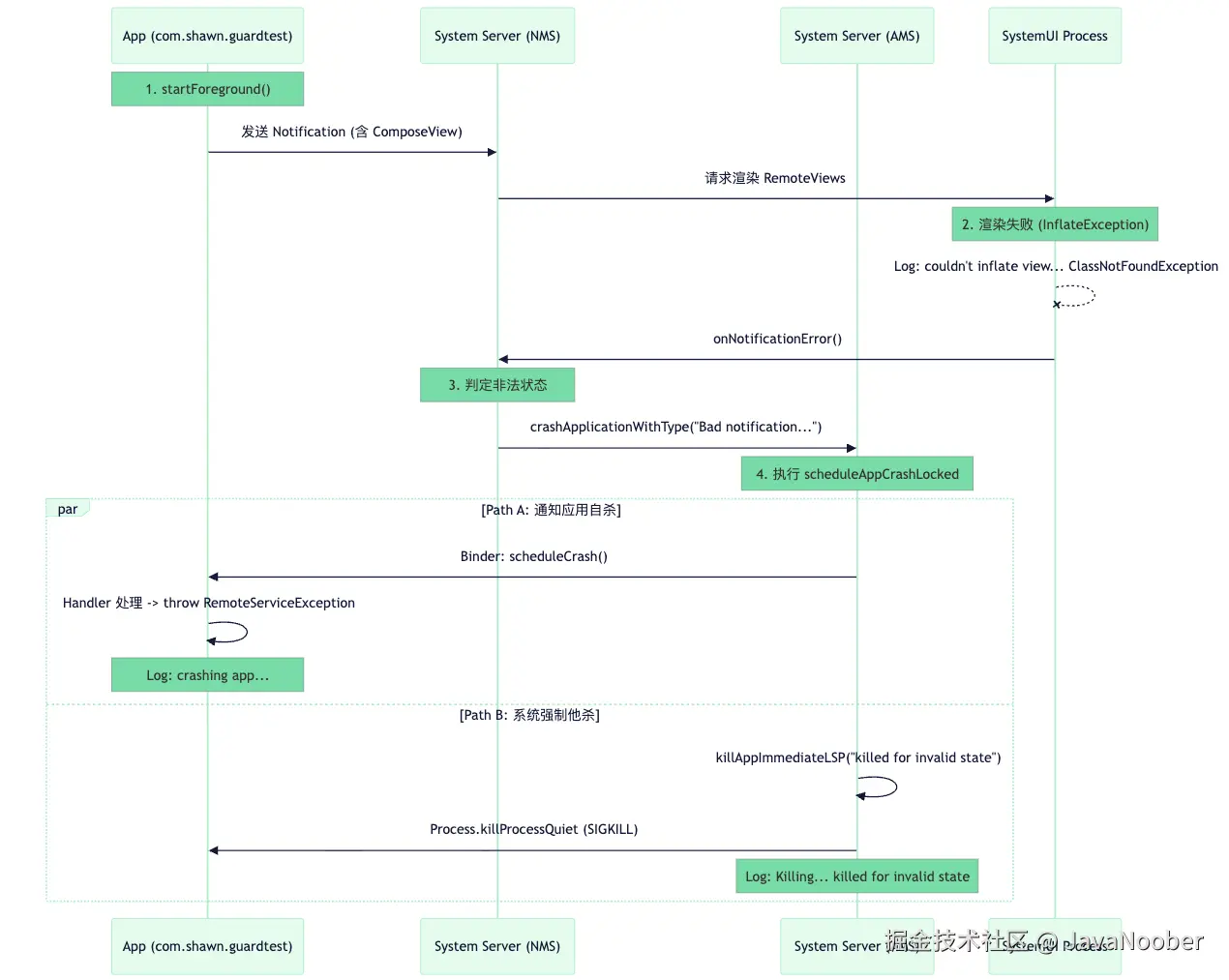 FATAL EXCEPTION。 你会看到RemoteServiceException或BadForegroundServiceNotificationException。 Crashlytics/Bugly 等崩溃上报工具能捕获到这个异常。 - 目的 : "告知" 。如果没有这一步,你的进程突然消失了,没有任何 Java 堆栈信息,开发者会一脸懵逼。