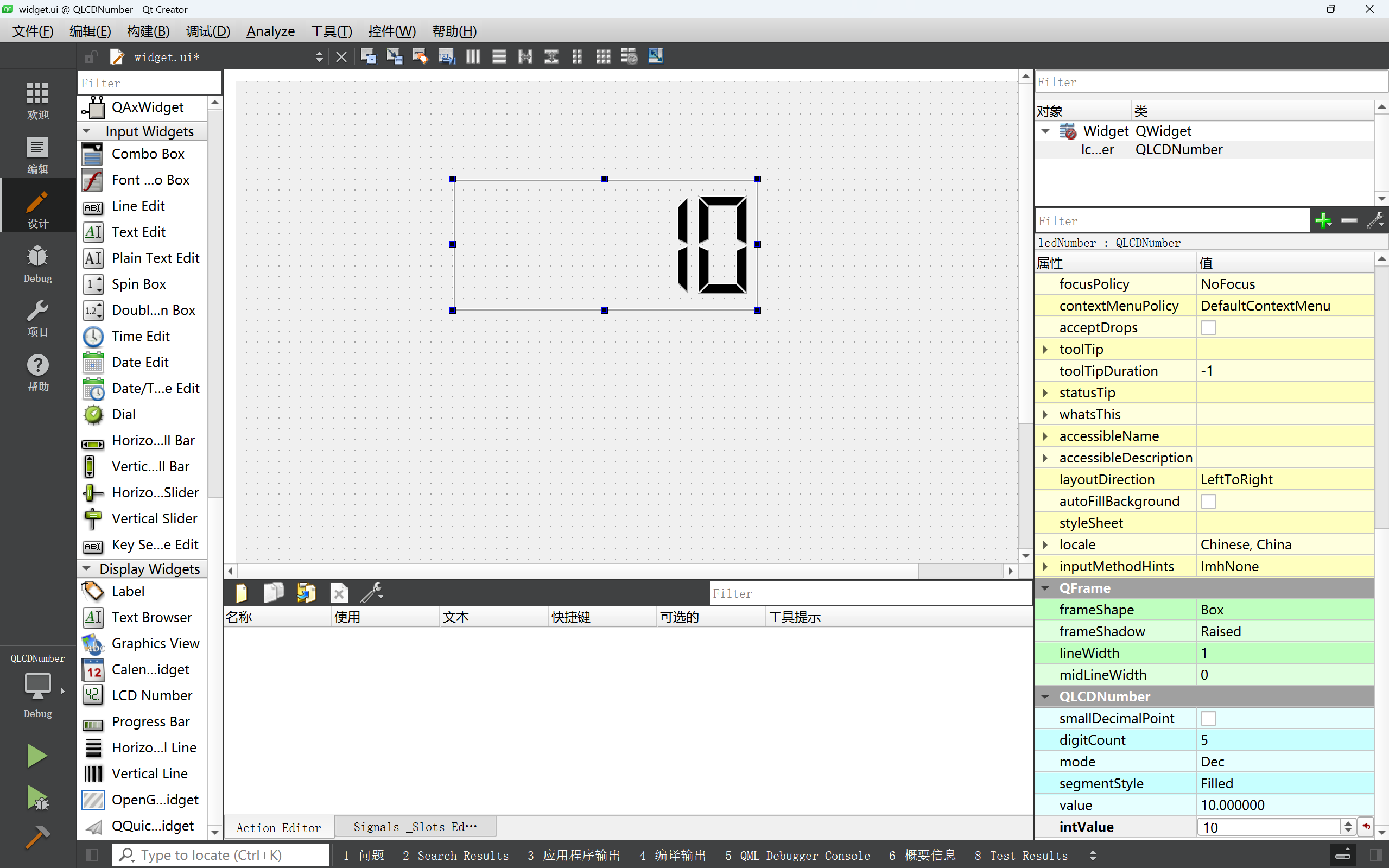 - 在界⾯上创建⼀个 QLCDNumber , 初始值设为 10. objectName 为 lcdNumber