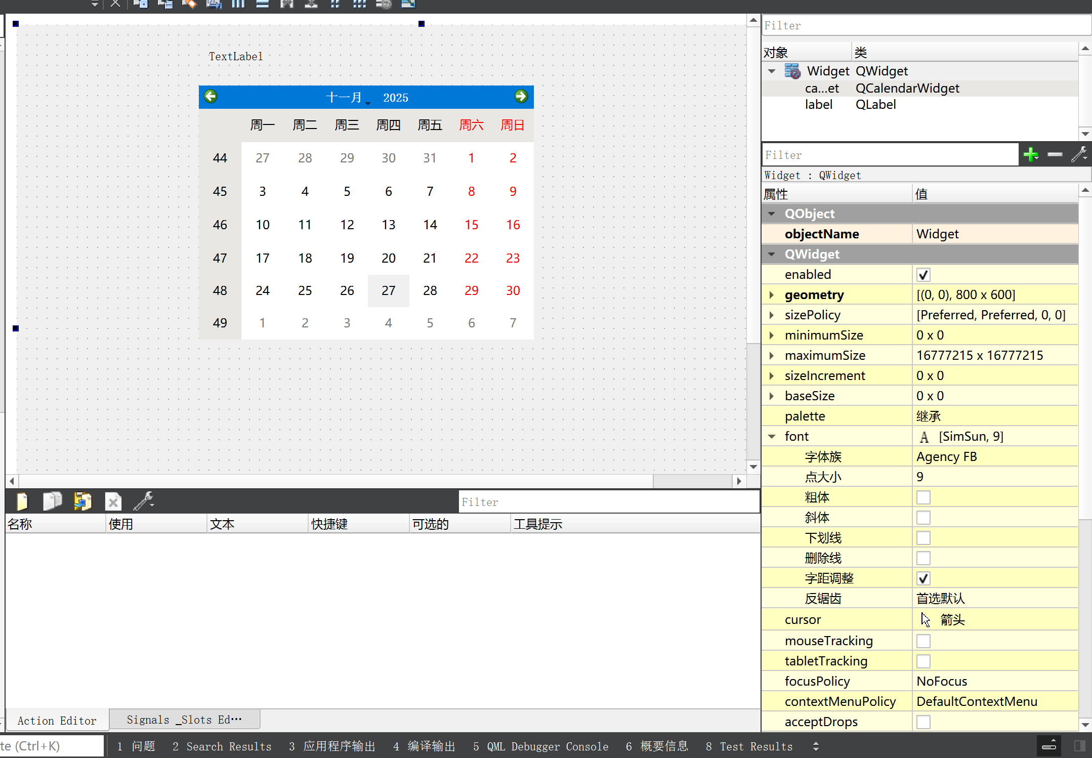 - 在界⾯上创建⼀个 QCalendarWidget 和 ⼀个 label ,objectName 为 calendarWidget , label