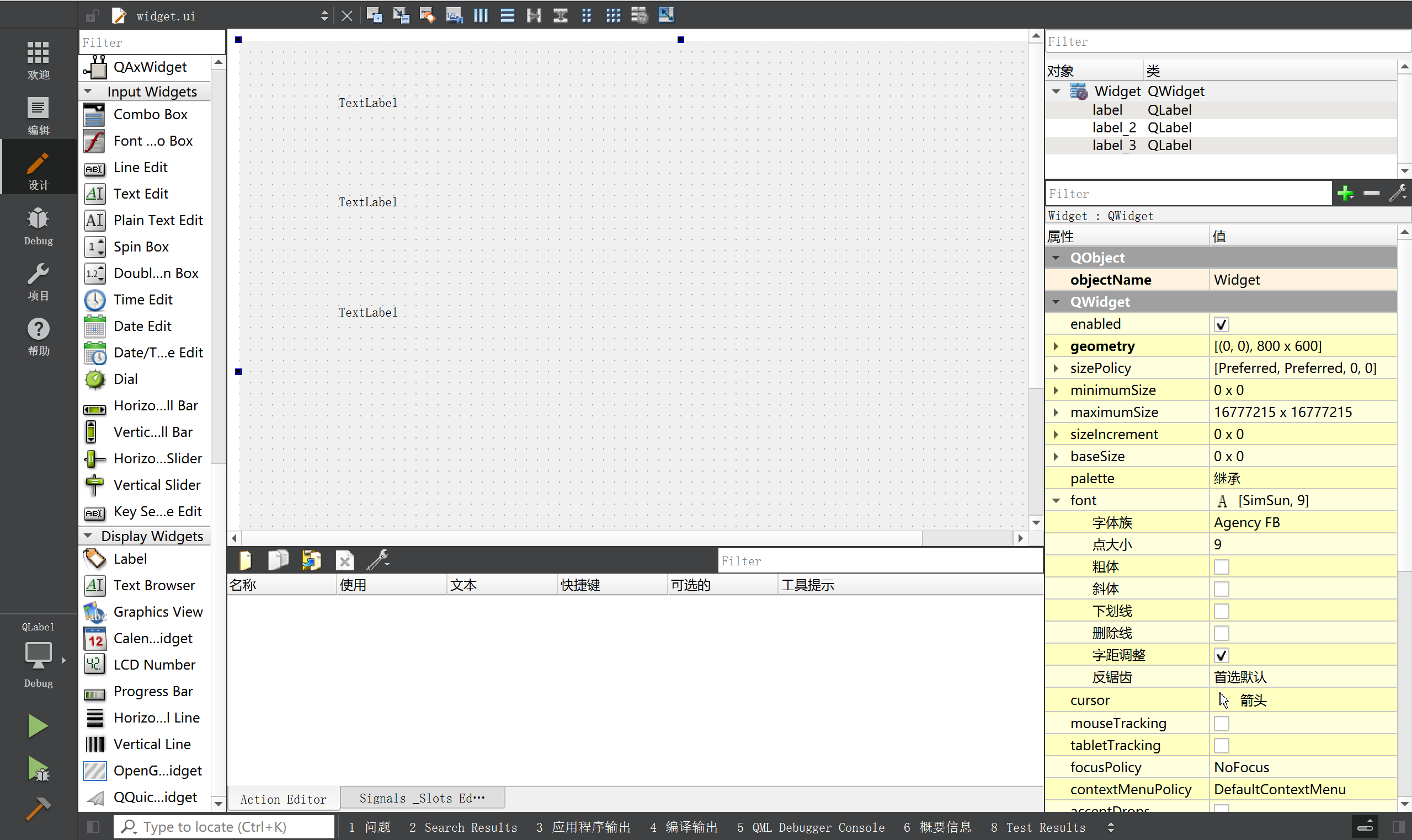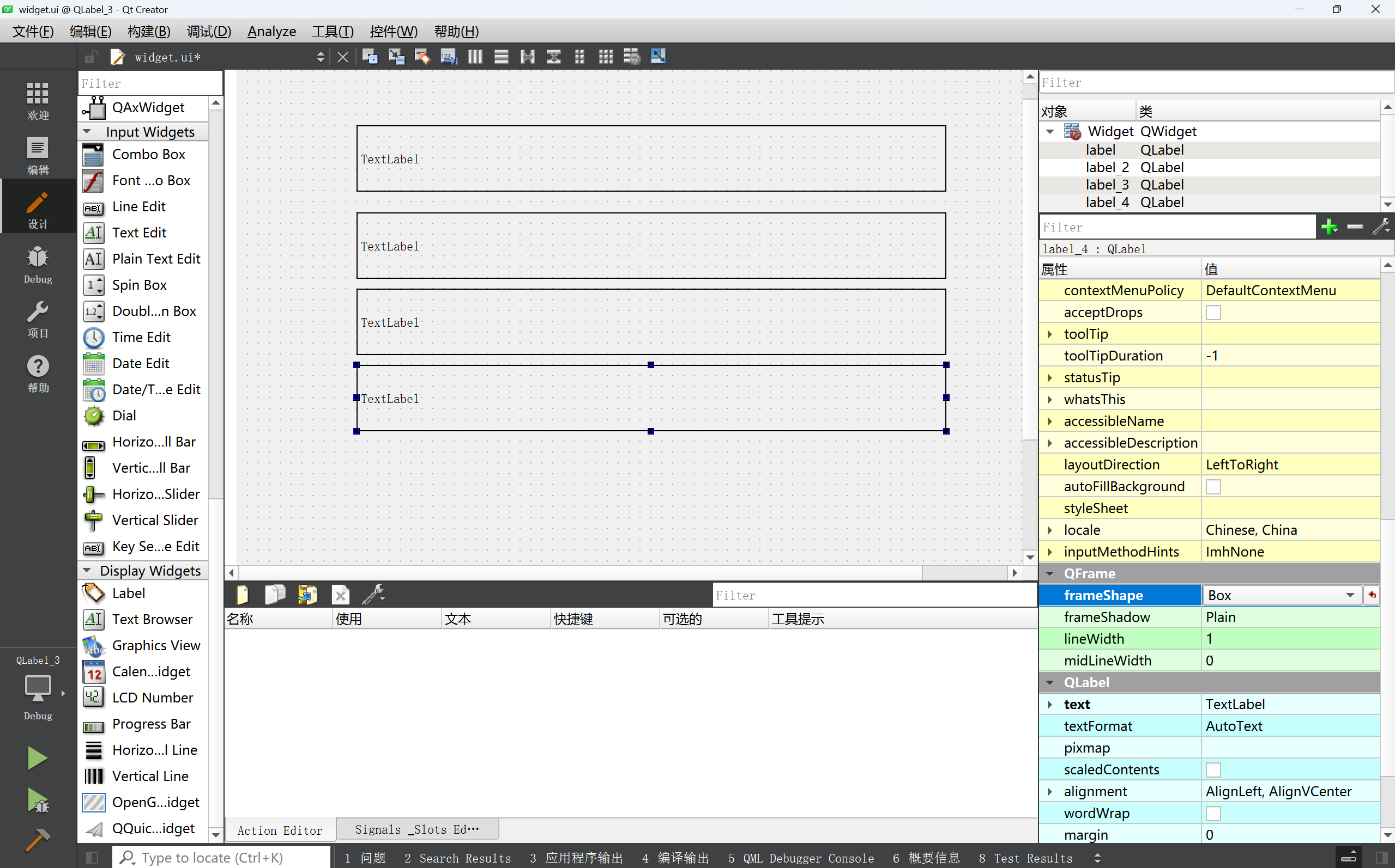- 修改 widget.cpp, 设置三个 label 的属性