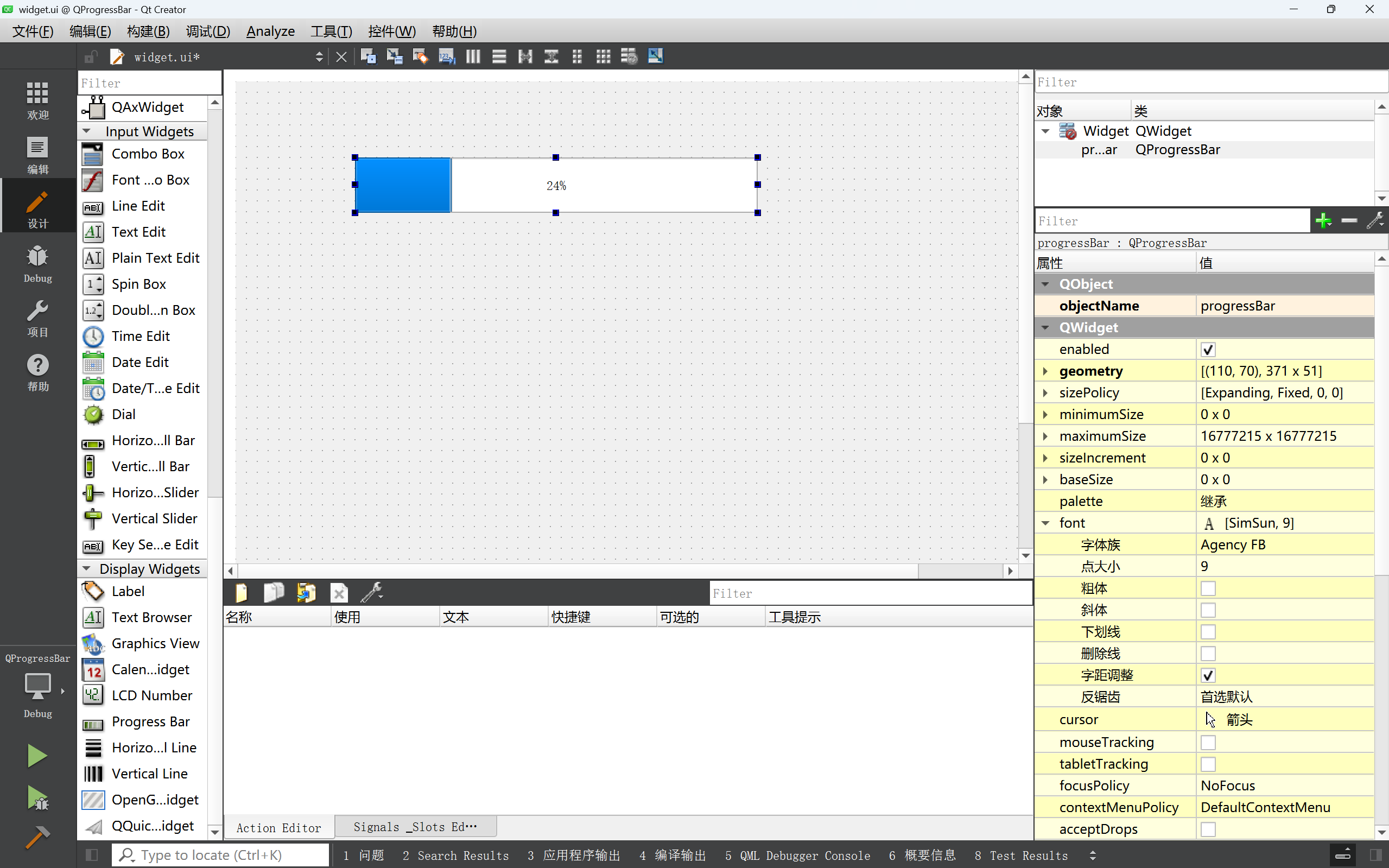 - 在界⾯上创建进度条, objectName 为 progressBar,其中最⼩值设为 0, 最⼤值设为 100. 当前值设为 0