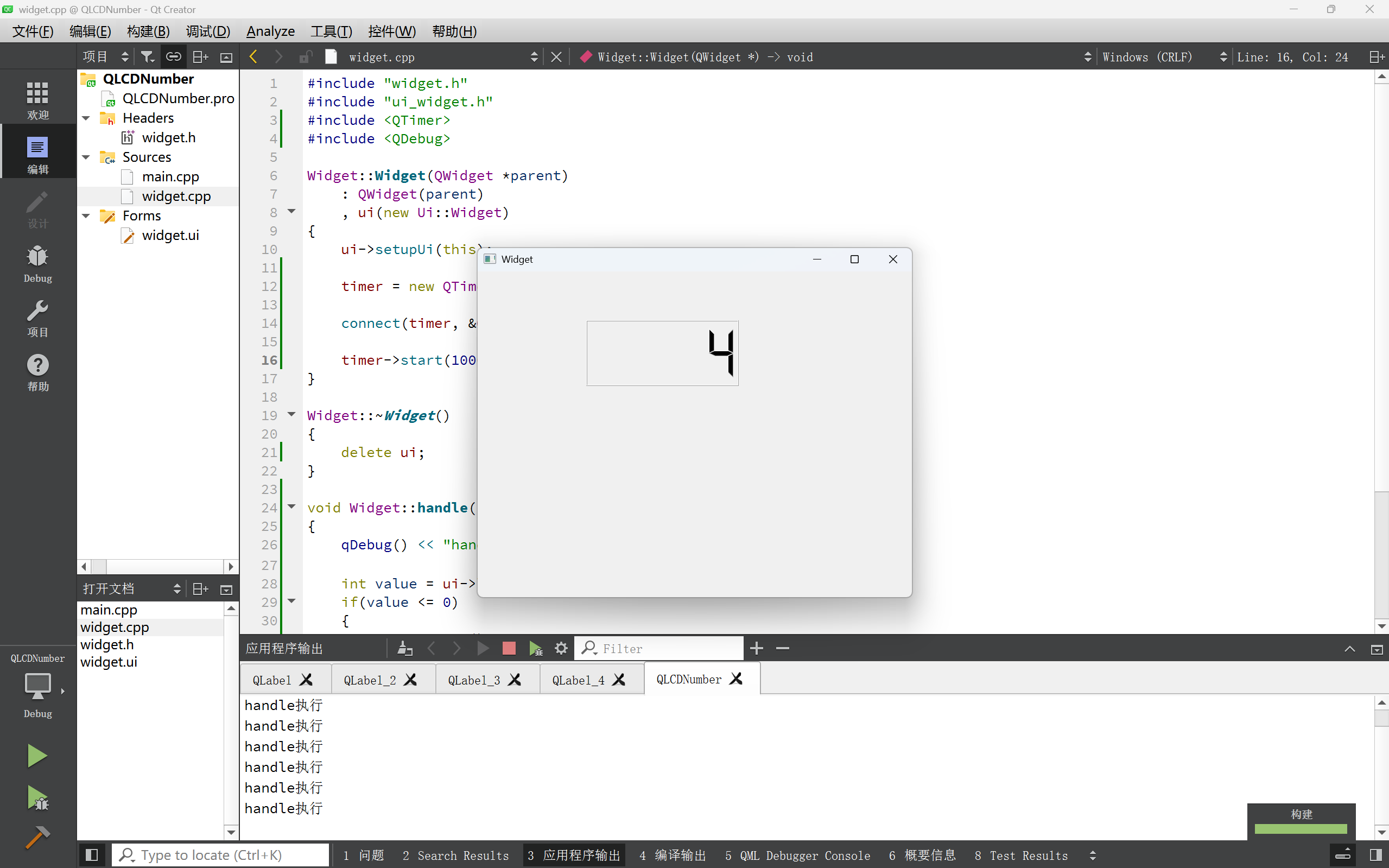 - 修改 widget.h 代码, 创建⼀个 QTimer 成员, 和⼀个 handle 函数,并在widget.cpp实现