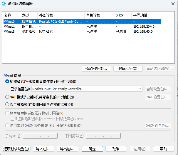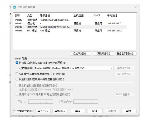VMnet0、VMnet1、VMnet8 分别对应桥接模式、仅主机模式、NAT 模式的