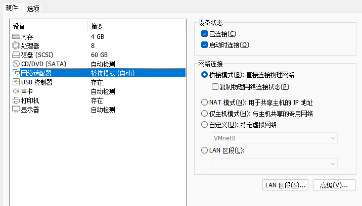 可见我电脑选用了有线网线来连接路由器,然后我选择桥接到这个有线连接的网卡上,然后虚拟机的网路适配器要选择桥接模式