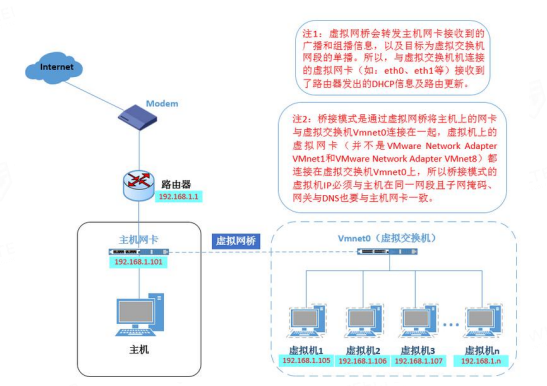 原理:VMware 就像在你的物理网卡上搭了一座"桥"。虚拟机直接使用物理主机的真实网卡连接到外面的路由器。vmware创建了一个vmnet0虚拟交换机,用于连接物理主机和虚拟机。然后vmnet0虚拟交换机与物理网卡之间的连接就依靠这个虚拟网桥,下图可见