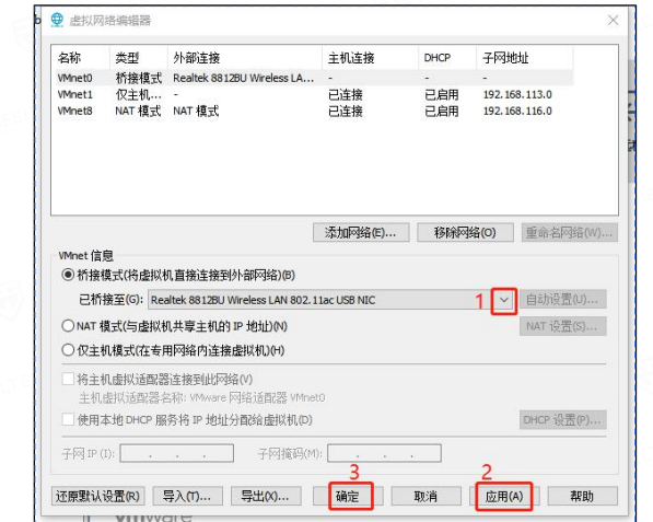 每个VMnet可以选择设置为桥接/仅主机/NAT模式其中的一种,但是需要注意的是仅主机和NAT模式在VMWare内都只能存在一个。