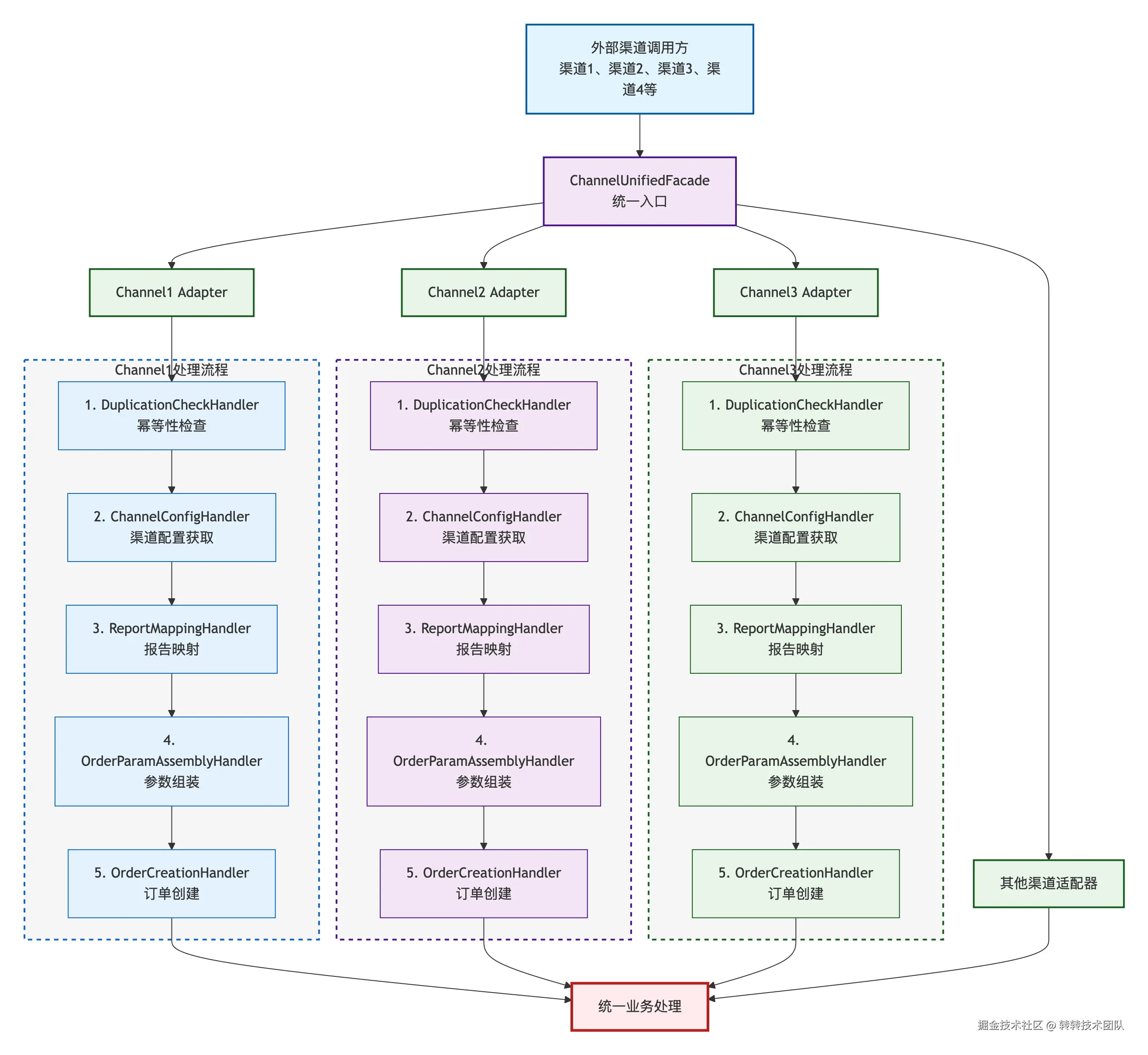 java// A渠道:标准流程 chain.addHandler(duplicationCheck) .addHandler(channelConfig) .addHandler(reportMapping) .addHandler(orderParamAssembly) .addHandler(orderCreation); // KA渠道:额外增加权限校验 chain.addHandler(duplicationCheck) .addHandler(kaAuthCheck) // KA特有 .addHandler(channelConfig) .addHandler(reportMapping) .addHandler(orderParamAssembly) .addHandler(orderCreation);