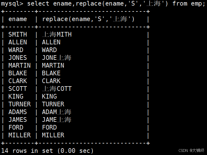 注意:length函数返回字符串长度,以字节为单位。如果是多字节字符则计算多个字节数;如果是单字节字符则算作一个字节。比如:字母,数字算作一个字节,中文表示多个字节数(与字符集编码有关),utf8字符集下中文代表三个字符数 - 将EMP表中所有名字中有S的替换成'上海'